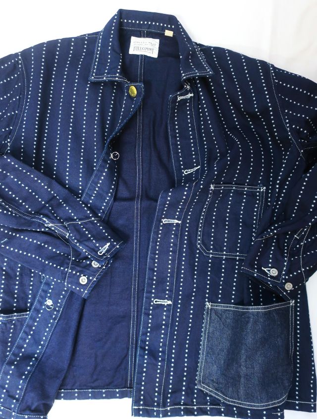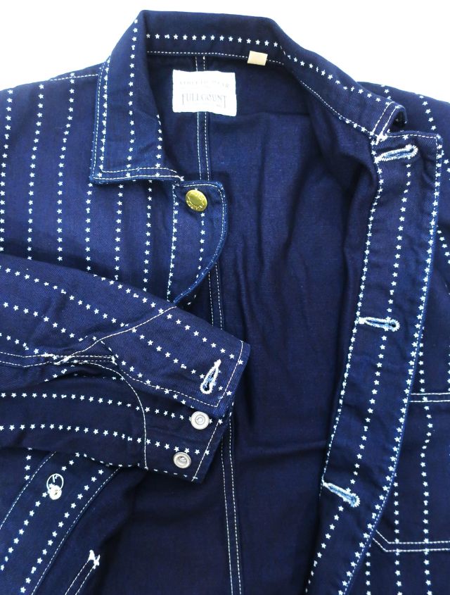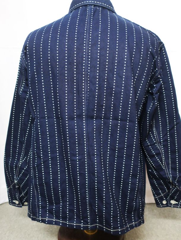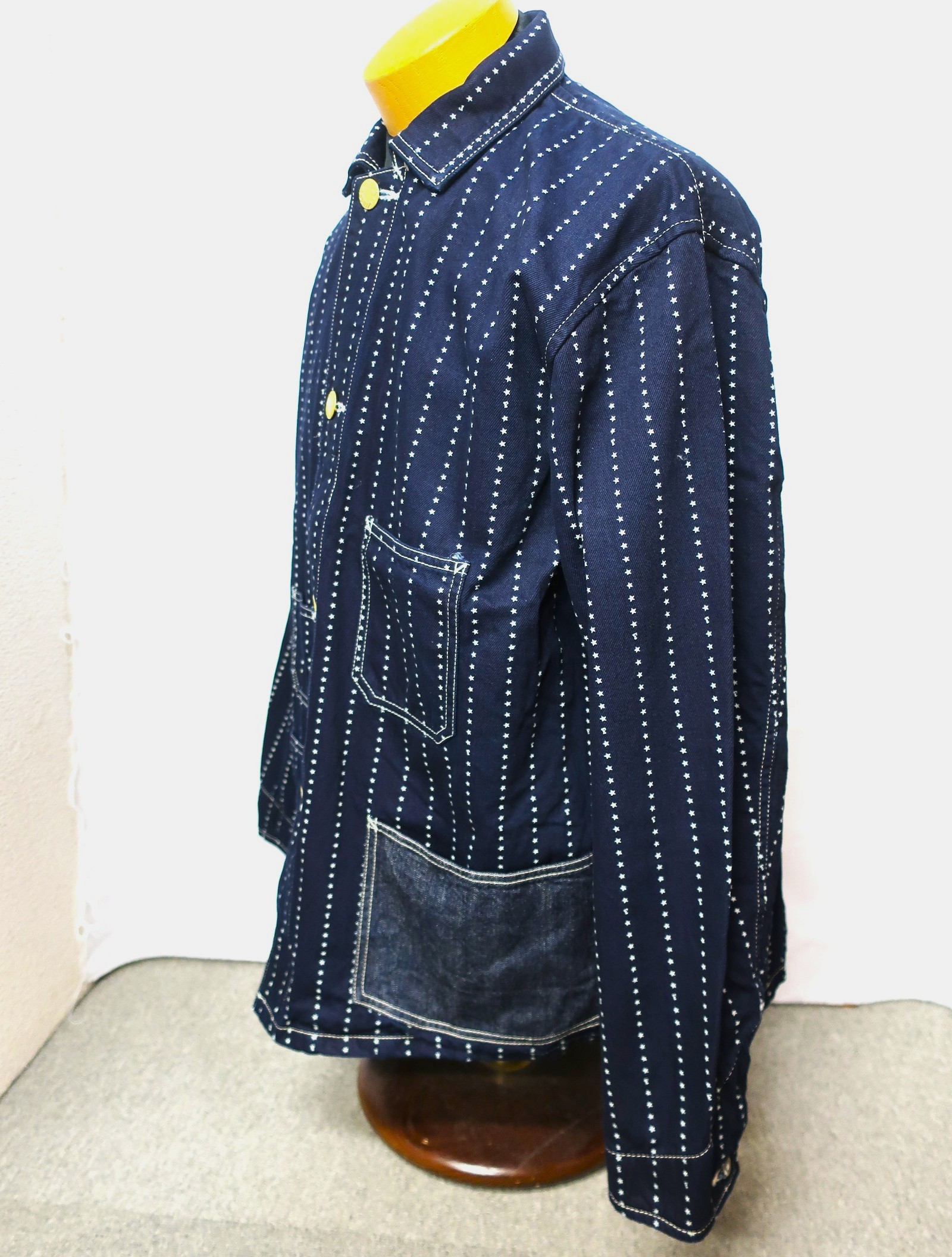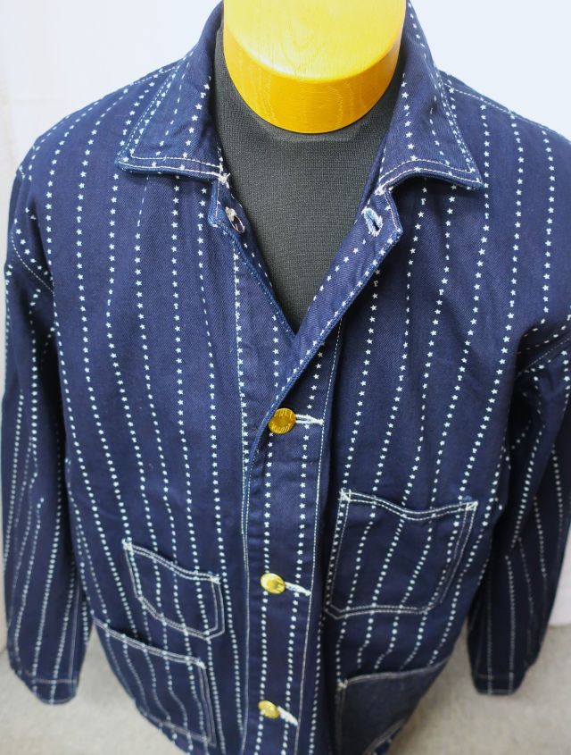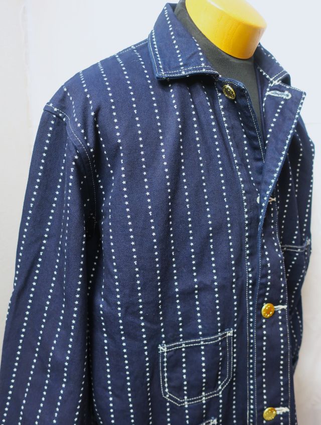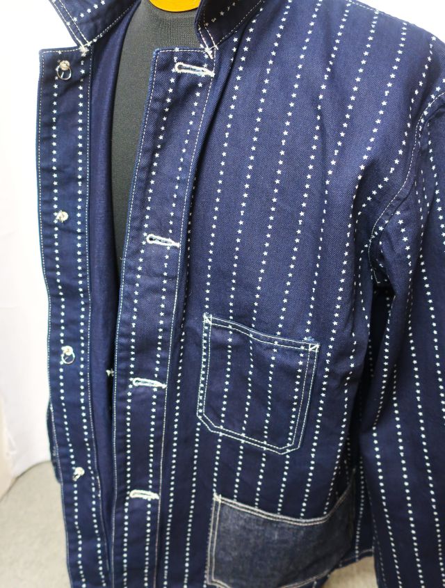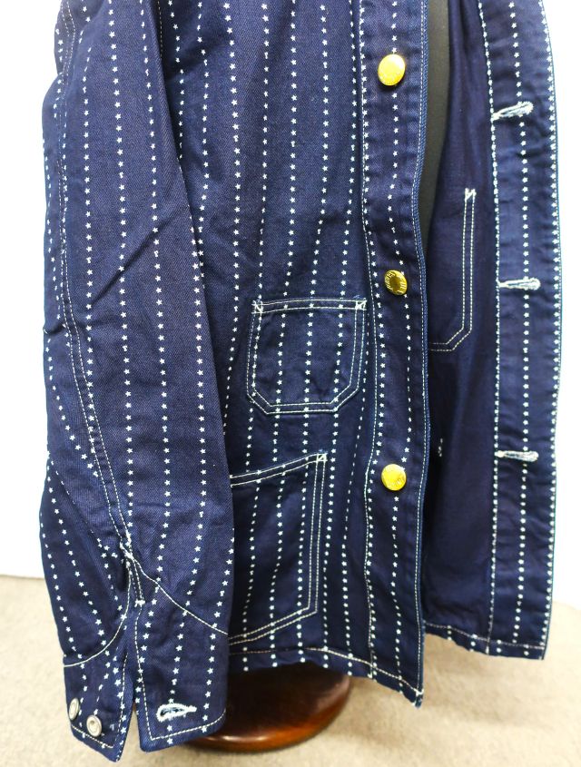 【 特徴 】 テイラーメイドの名残が強い1900年代初頭のAラインシルエットのチョアジャケット。また当時の特徴である変形ポケットに加え、左腰部分のポケット素材を変え、洗濯の際取り外せるようになるチェンジボタンは一本の足にリングが付いた1920年代以前のものを再現。インディゴ染めのカツラギ(Drill)素材に、スクリーンプリントで星柄のウォッシュストライプを施した素材。