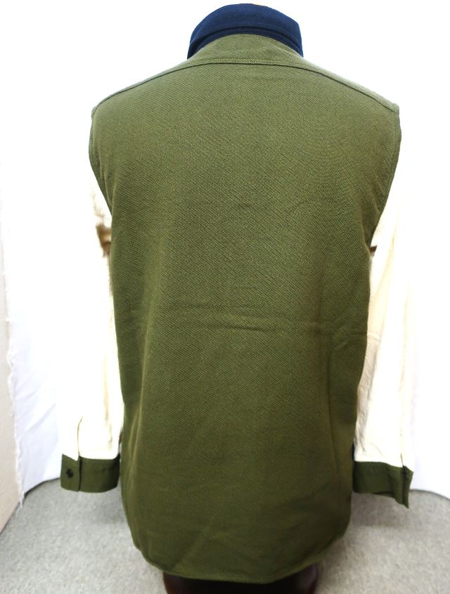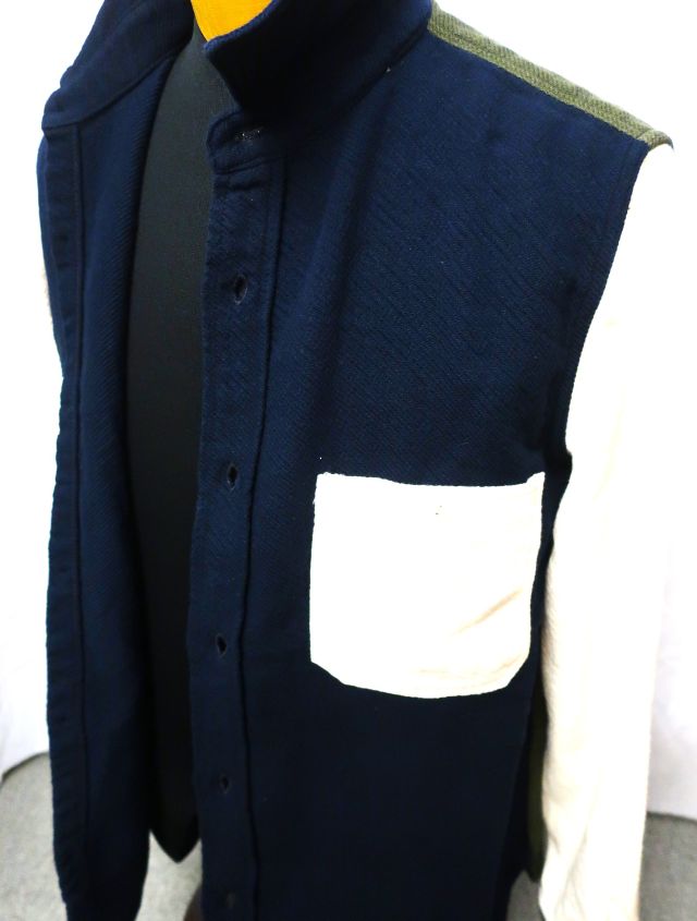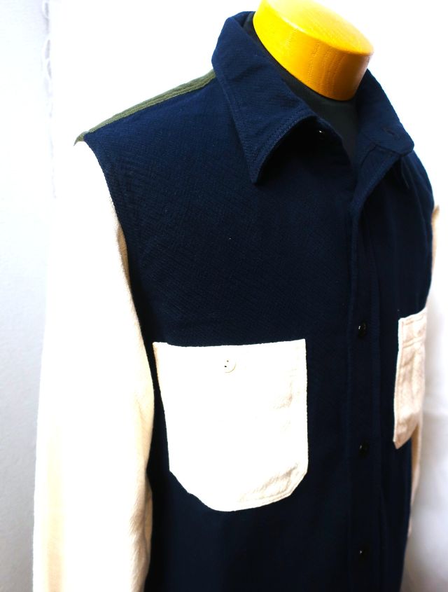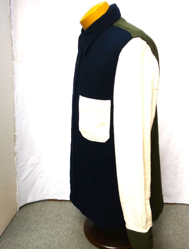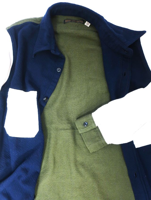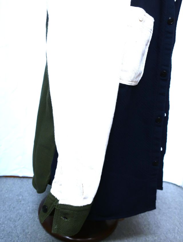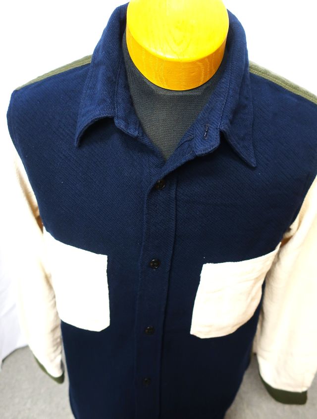 トリプルヤーンの無地ネルをピーターマックスにインスピアされ、クレイジーに配置したワークシャツ。ミリタリーカラーでシンプルな仕上りです。