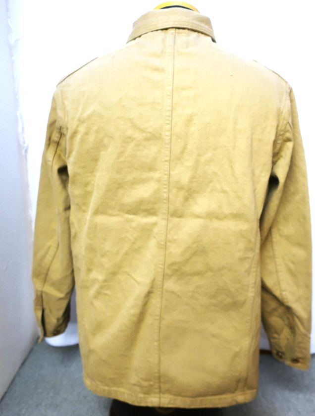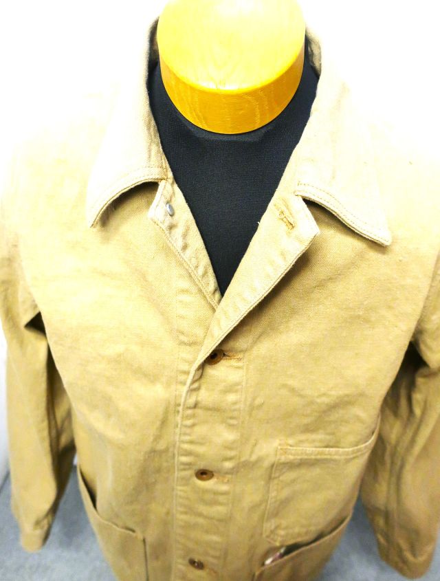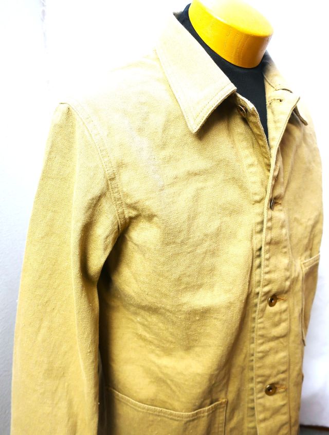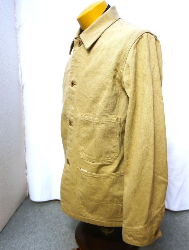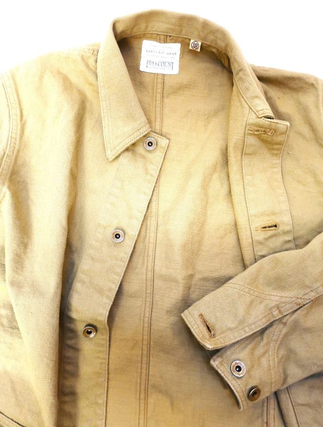 【 特徴 】 タテ・ヨコ共にベージュに染色した番手違いのムラ糸を( #7番 x #10番 ) スーパースムースデニムの手法を用い力織機で織り上げた12オンス デニムを使用した2015型チョアジャケット。ヨコ糸を染めた事で生まれる奥行きのある色目と、通常のデニムとは異なる手織り感覚の風合いが特徴です。