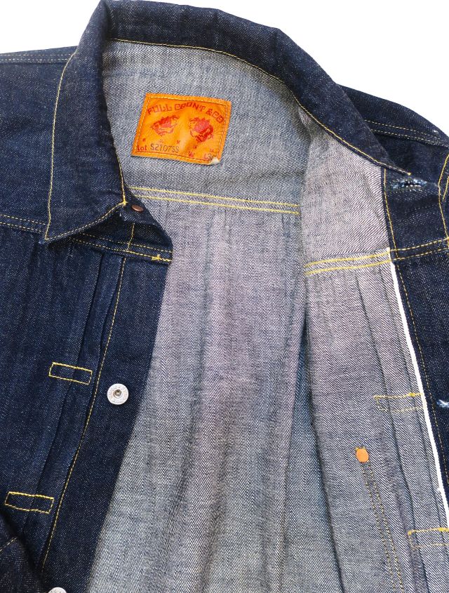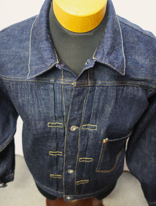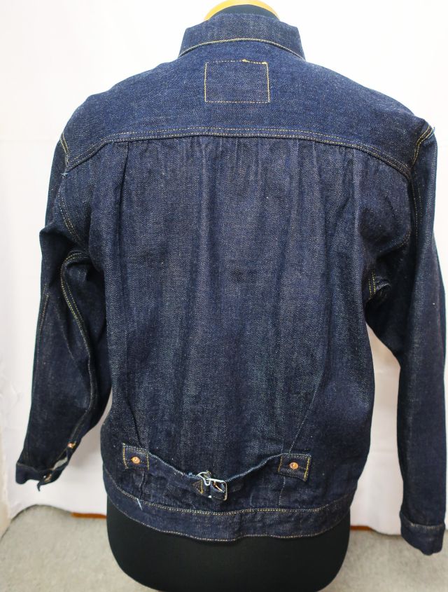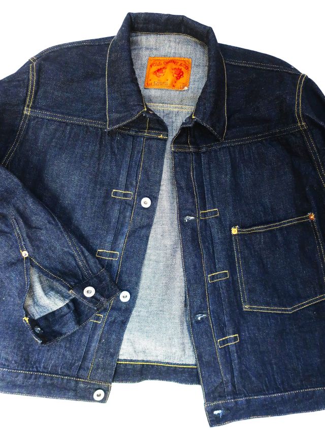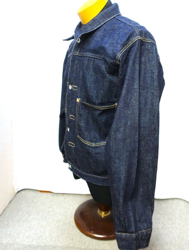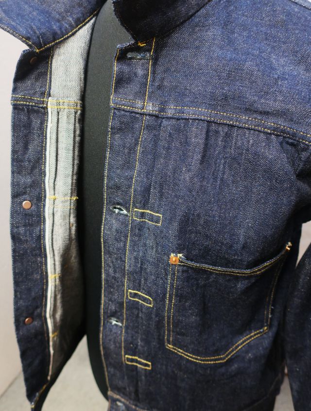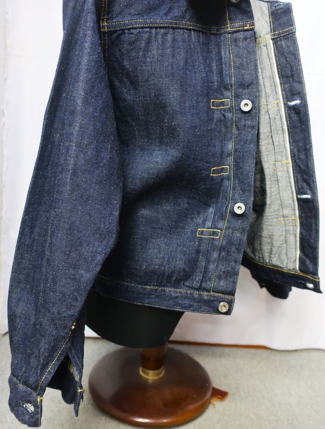 【 特徴 】 定番の11.5oz デニムを使用した大戦モデルのデニムジャケットです。オリジナルで新たに作製した鉄製の唐草模様のドーナツボタン、刻印なしの打ち抜きリベット、フロントプリーツ抑えステッチのサイズなど、第二次世界大戦のディテールを網羅しています。しっかりと強い糸調子でパッカリングを強調した縫製にしました。ステッチの色目はイエロー系のグラデーションになります。着丈は定番ジャケットより1cm短くなっています。