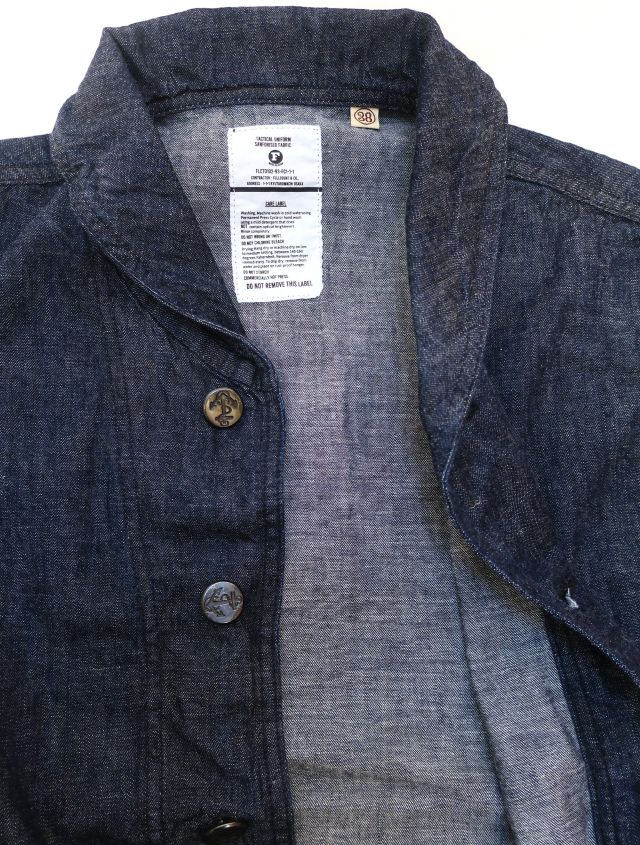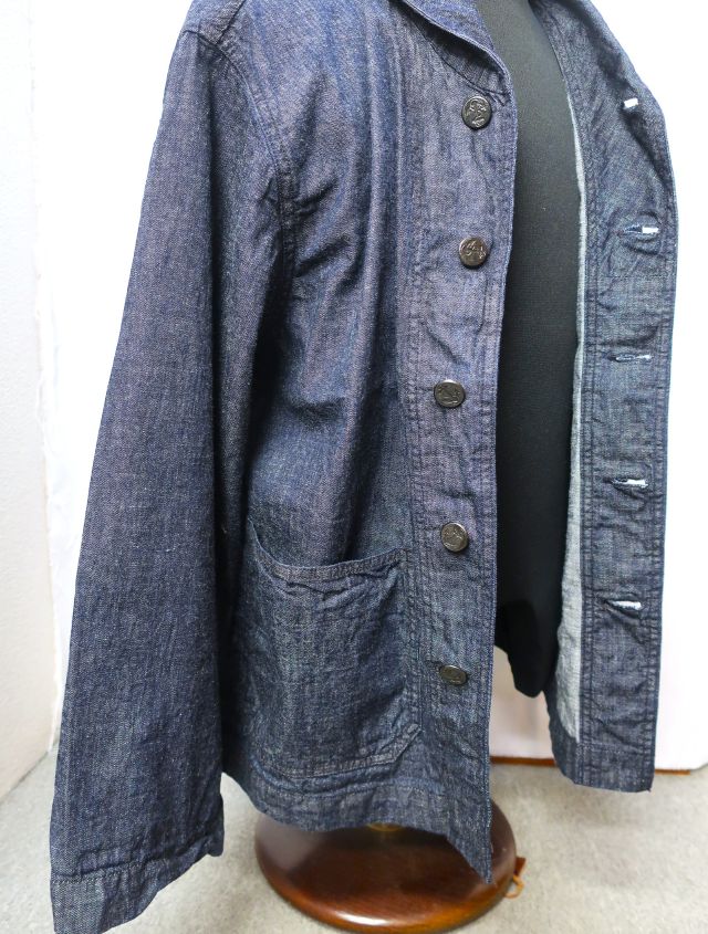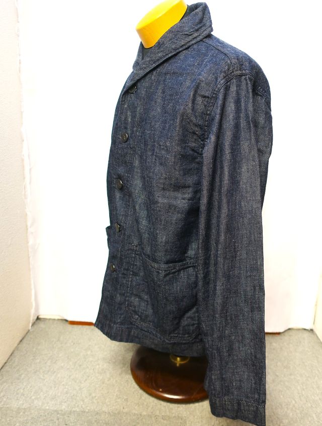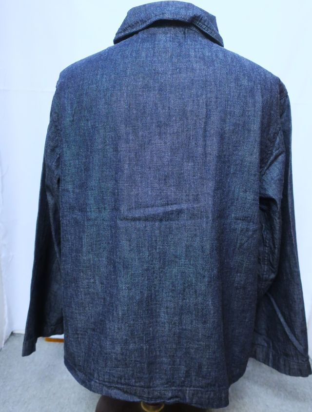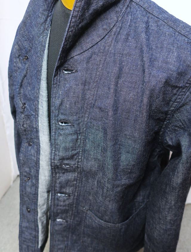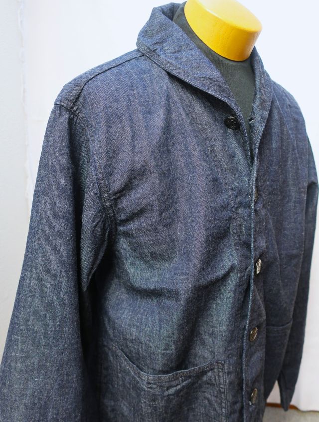 【 特徴 】 見た目の想像を超える素材の軽さとしなやかさが病みつきになるジンバブエコットン 8oz デニムを使用したショールカラー カバーオール。フロントは40's ディテールをディテールを踏襲したアンカーマークの刻印が入ったチェンジボタン。ショート丈でルーズ目な身幅、袖は可動域を優先しテーパーがほとんどないパターンです。裾のベンチレーションには役割をみいだすことができませんが、ロマンとしてつけています。