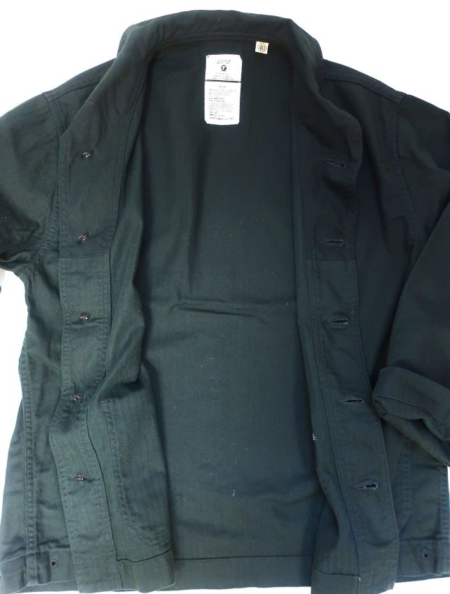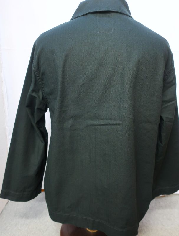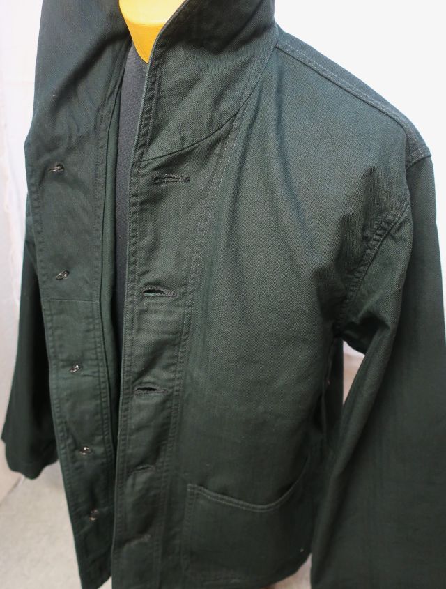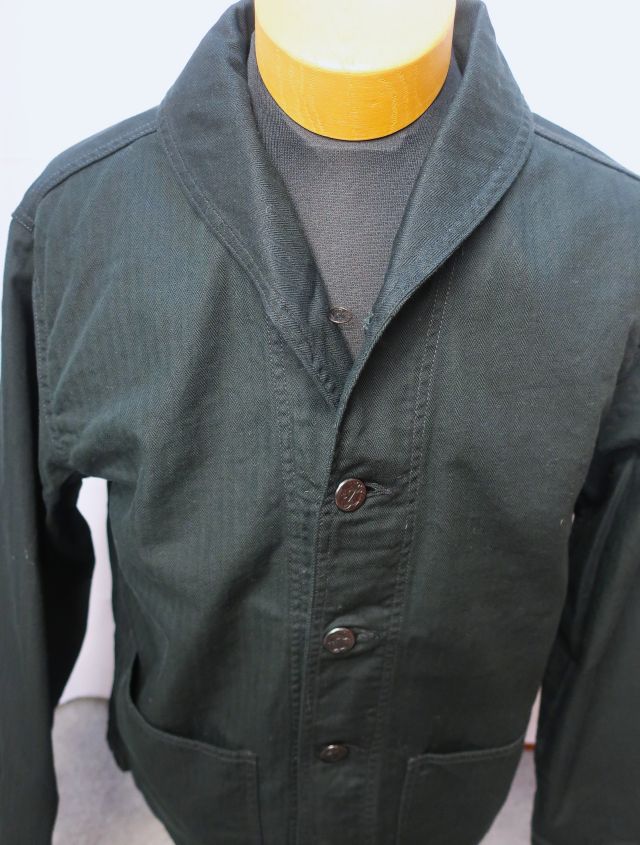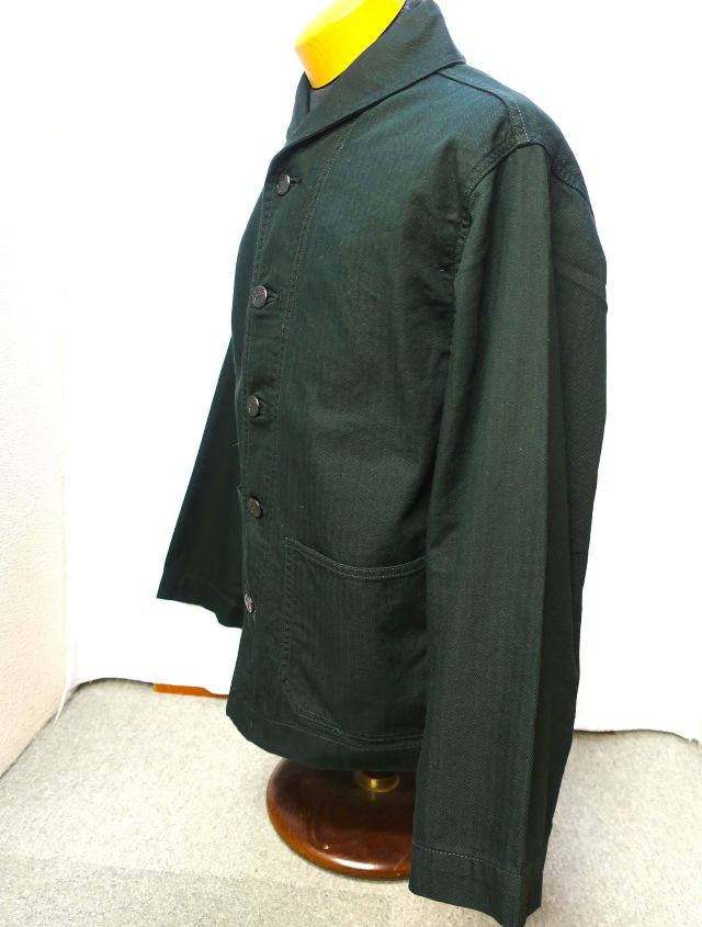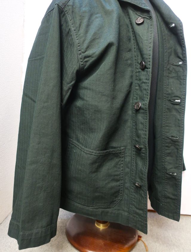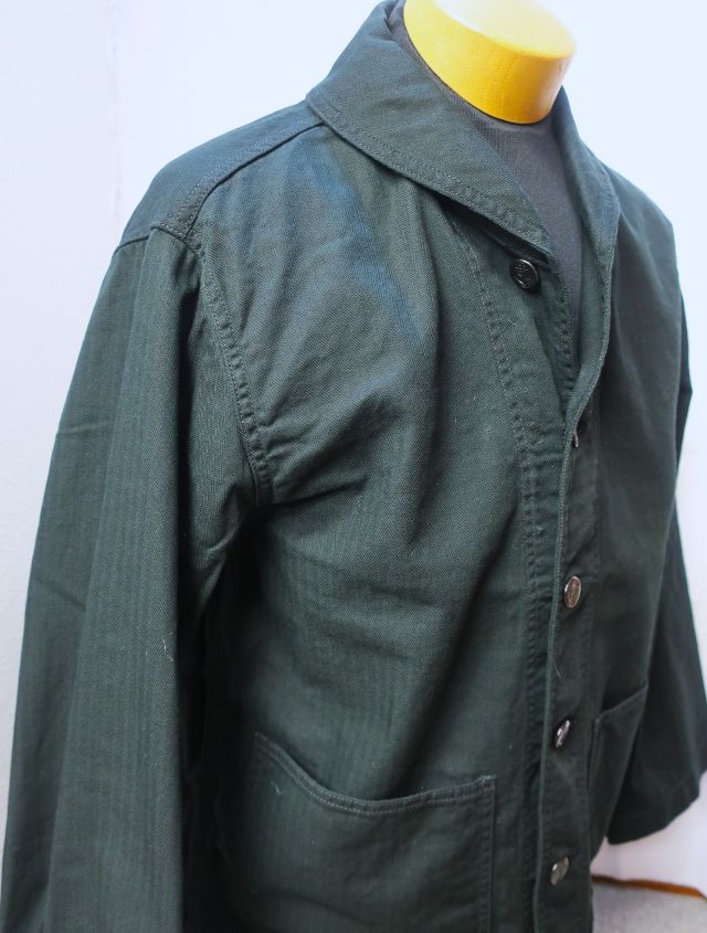 【 特徴 】 10sの糸を用いたミリタリー ヘリンボーン素材を用いたショールカラー カバーオール。フロントは40's ディテールをディテールを踏襲したアンカーマークの刻印が入ったチェンジボタン。ショート丈でルーズ目な身幅、袖は可動域を優先しテーパーがほとんどないパターンです。裾のベンチレーションには役割をみいだすことができませんが、ロマンとしてつけています。