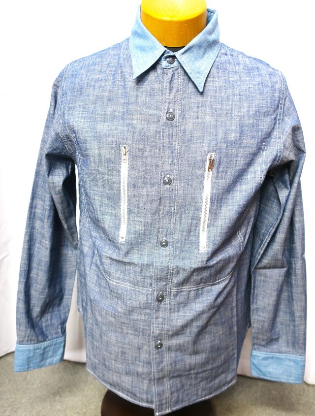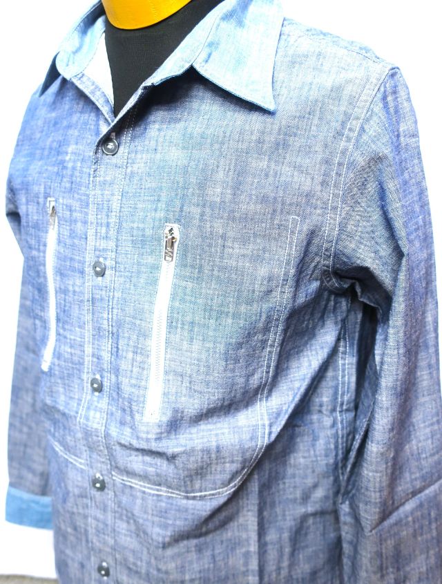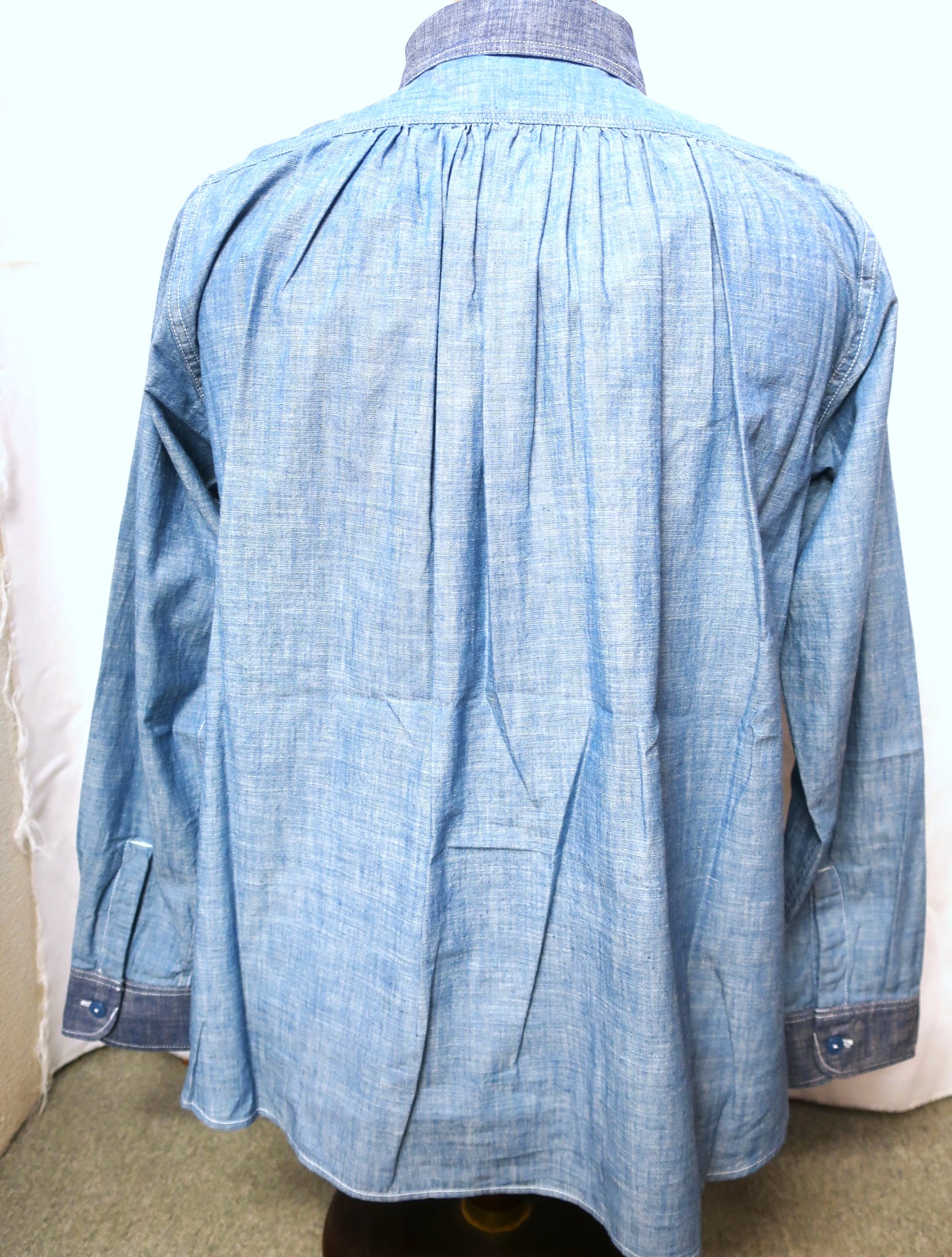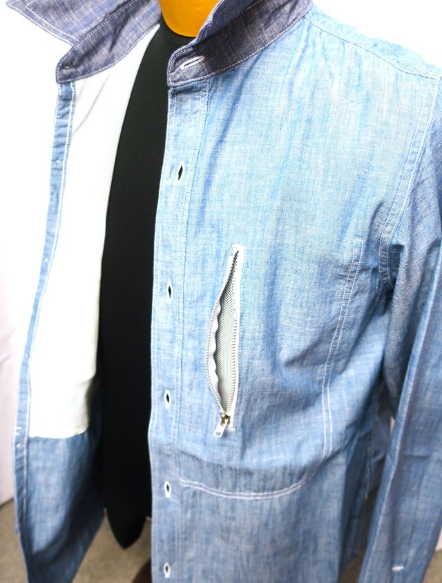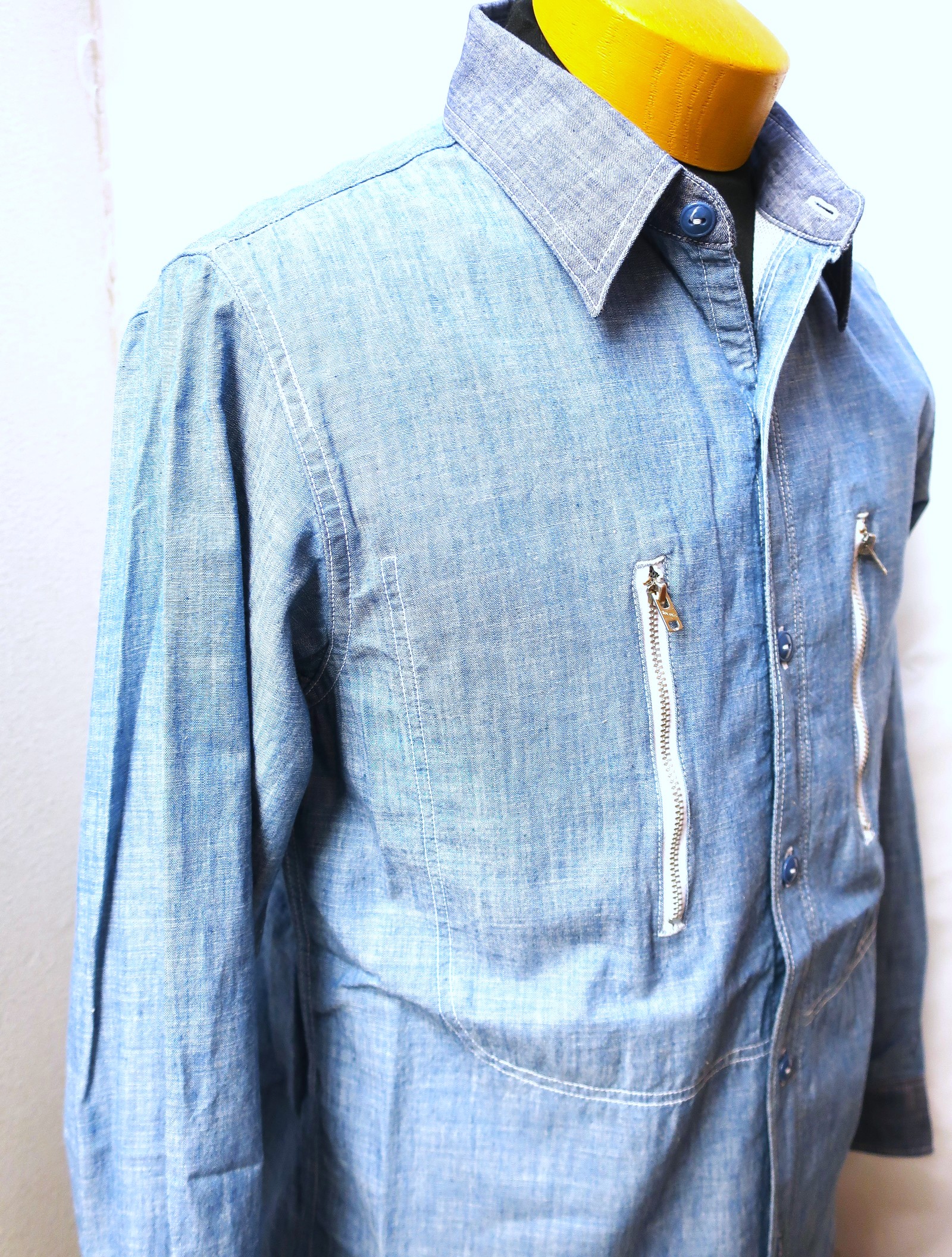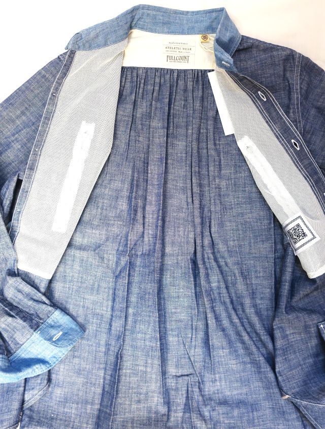 こちらはFULLCOUNTの定番4810 シャンブレーシャツにFUMITO GANRYUが再構築したデザインです。40sのUSN Chambray Shirtをベースに作成しているFULLCOUNTのデザインに2トーン切り替え、胸ポケットにはベンチレーションを携えた機能的なデザインとなっています。