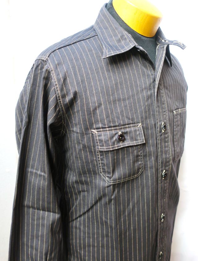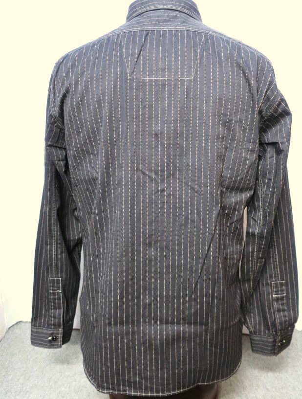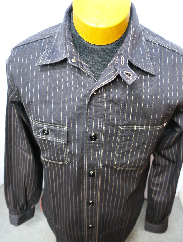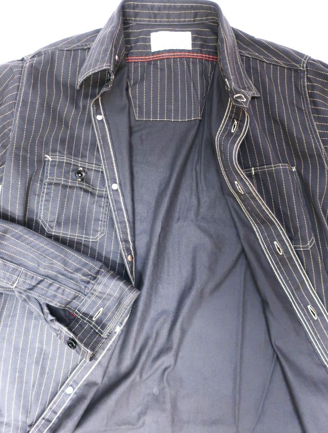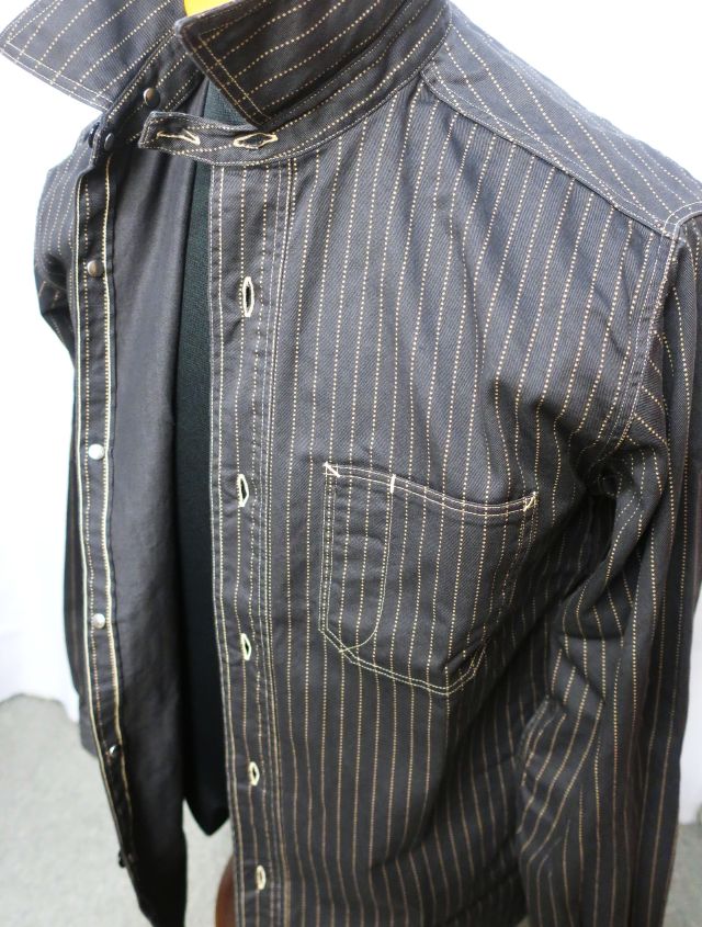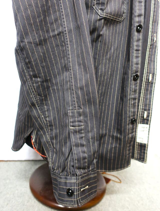 20世紀初頭に存在したものの、ヴィンテージで見つけることはインディゴブルーよりも困難なブラックウォバッシュストライプ。ブラックの硫化染料でベースを染めたあとに抜染でドットストライプをプリントしている。現存するヴィンテージから色を起こしたため、やや褪色した色味で仕上げている。