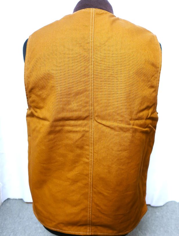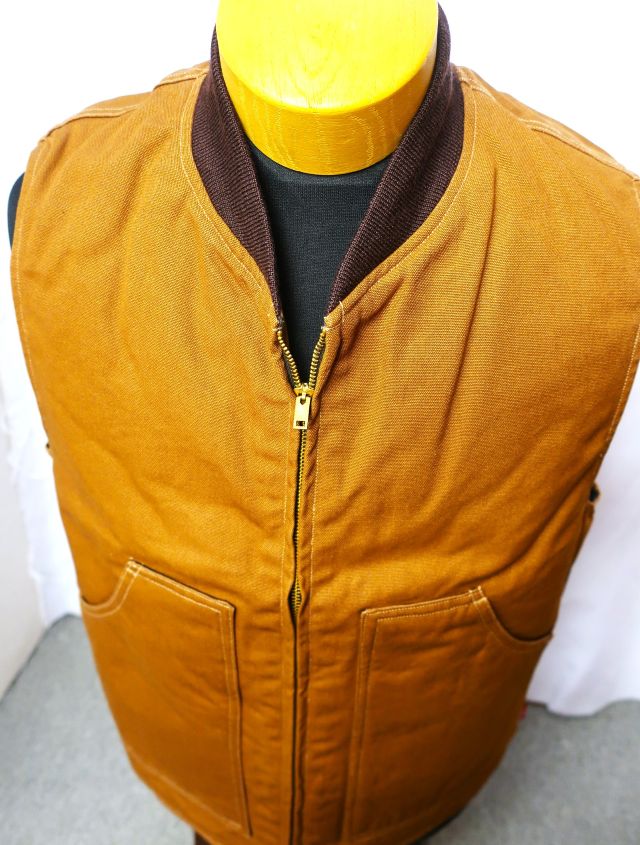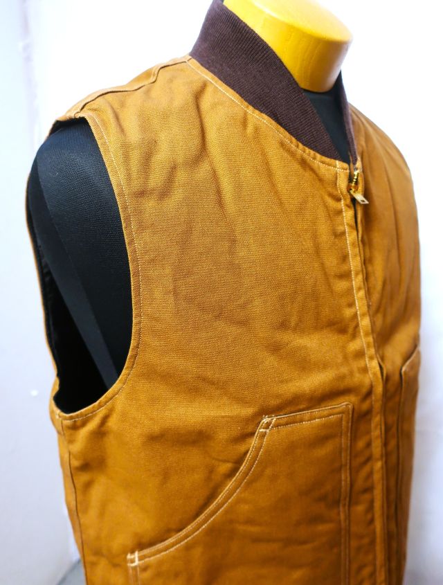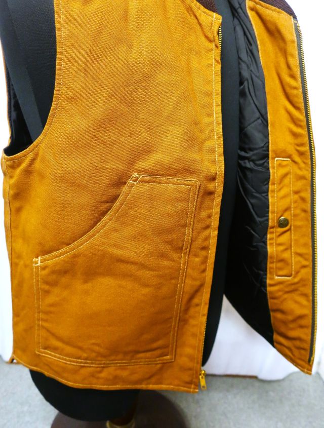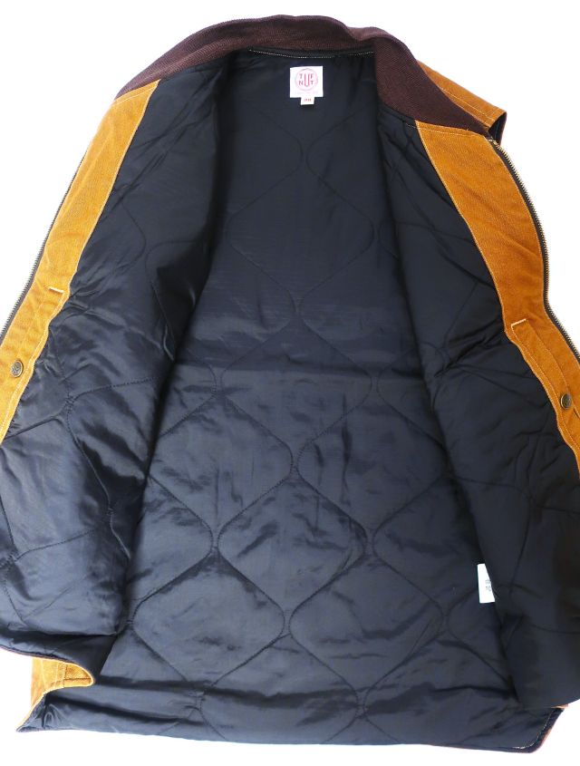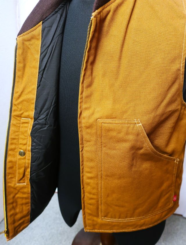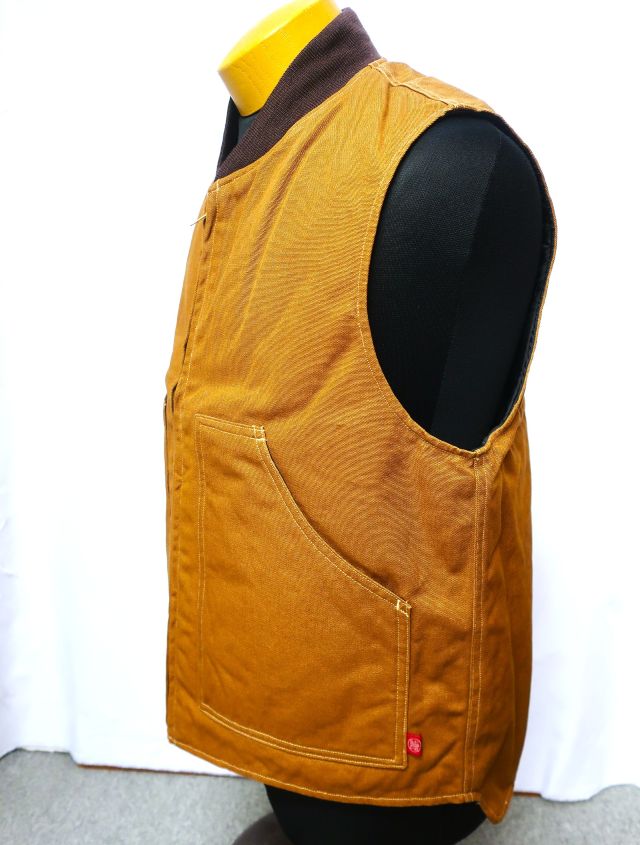 独自に織り上げた硫化染めの12.5ozコットンダック生地を使用したワークベスト。裏地には瓢箪キルテイングを施したナイロンリップストップを使用することで、防風性と保温性に優れた仕様となっている。新たに製作した赤いピスネームがアクセントになっている。