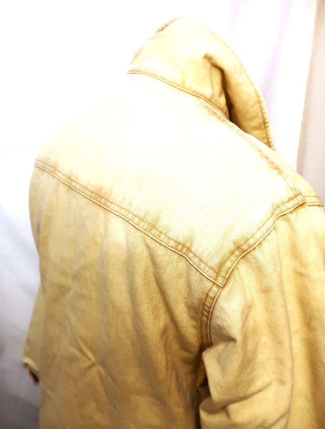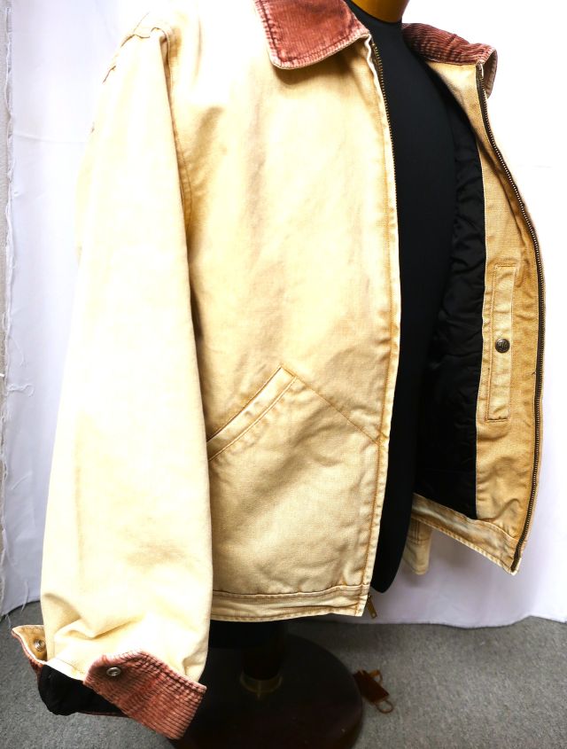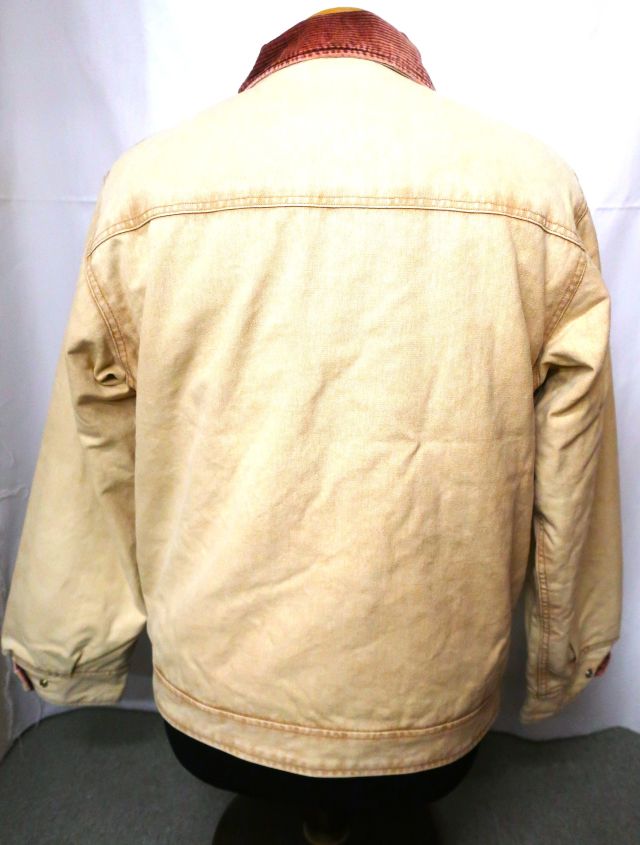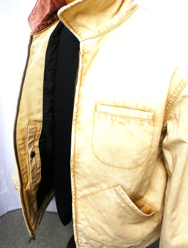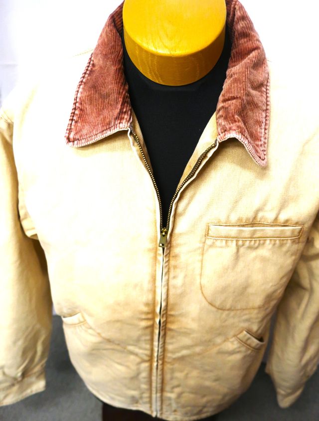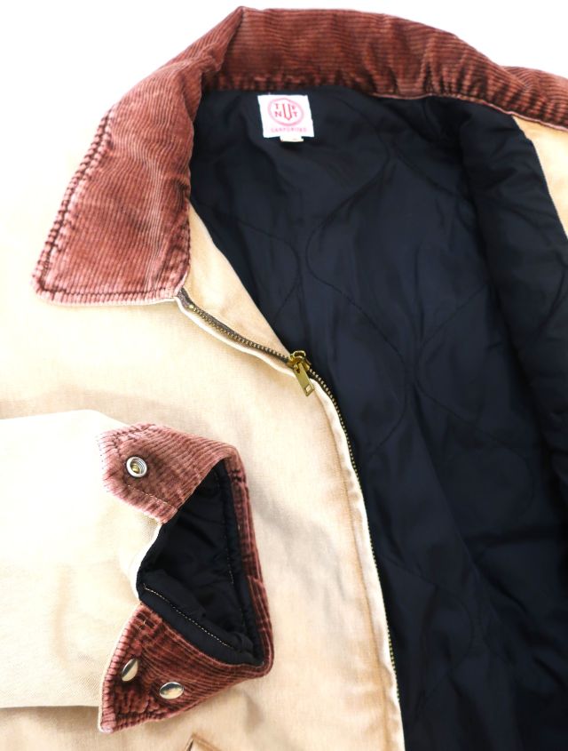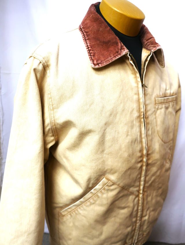 身頃に12.5オンスのコットンダック、襟とカフス裏に9ウェルのコーデュロイを使用したワークジャケット。裏地にキルティング生地を使用しており、袖口は2つのボタンで調整可能。独特な加工を施したエイジングモデルは襟元のコーデュロイの褐色も魅力です。