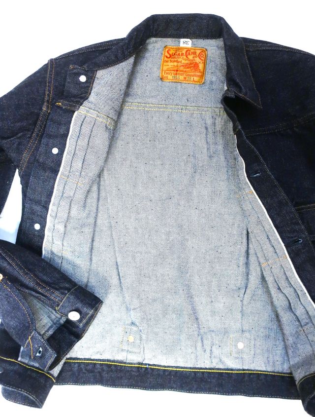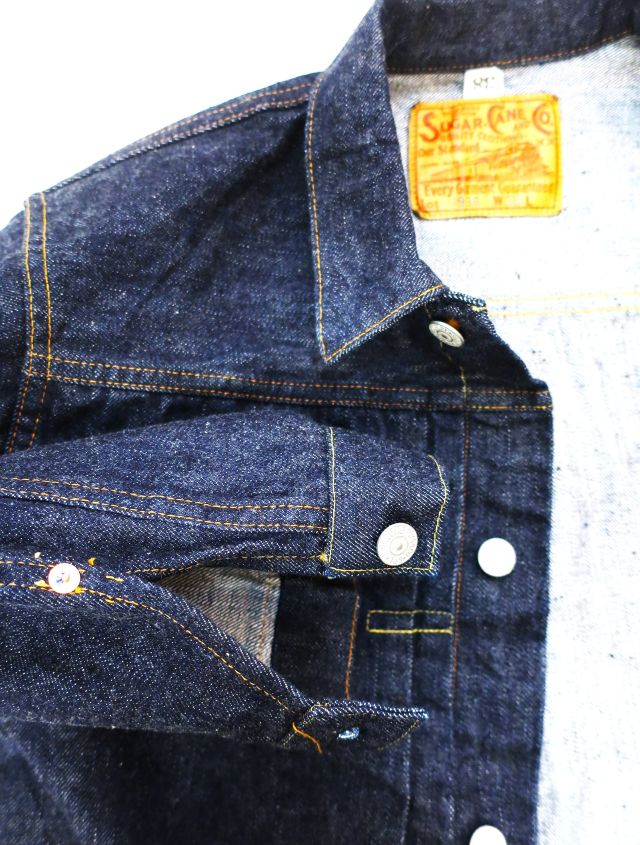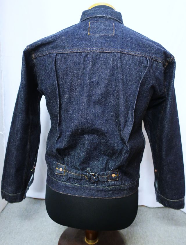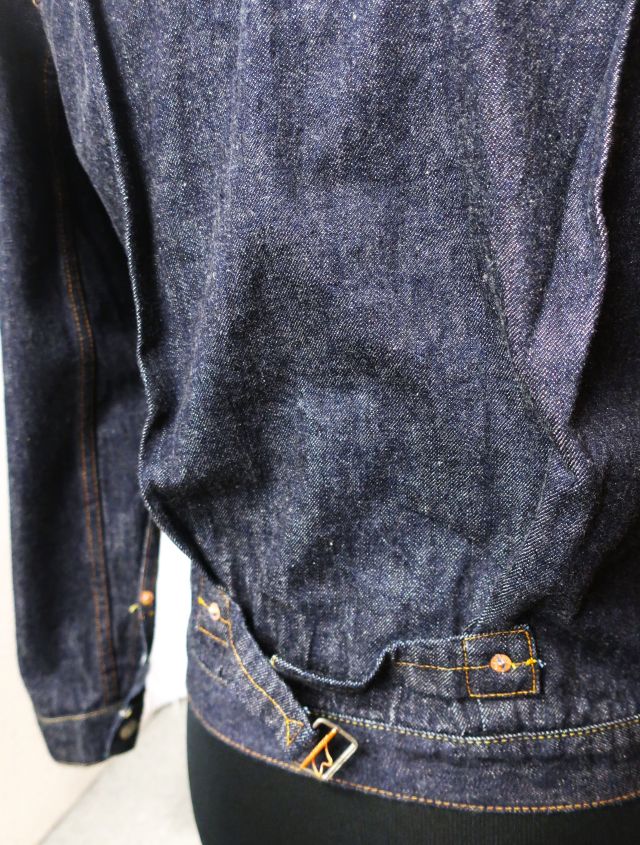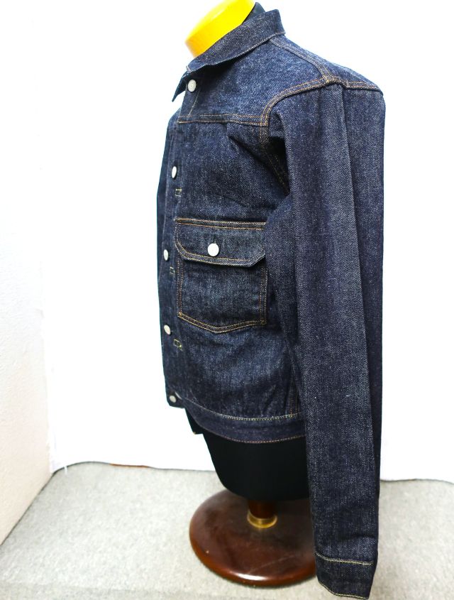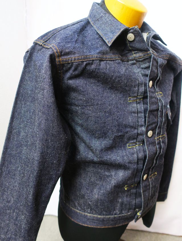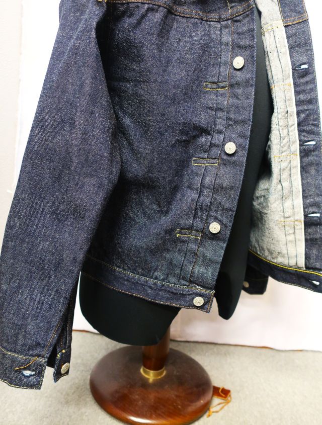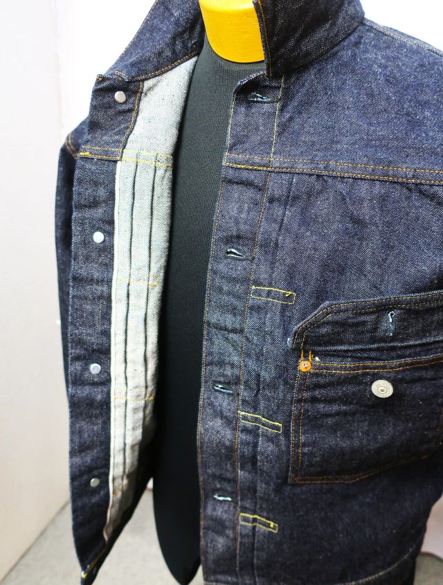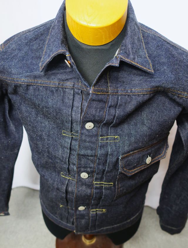 フロントや袖口のタックボタンが、パンツのフライ用のスモールボタンからトップ用のフルサイズに変わって間もない時代の1936年モデル・デニムブラウス。経糸7番×緯糸7番の未熟な紡績のムラ糸を使用した13.5oz.セルビッジデニムに、戦前らしいオレンジがメインのステッチワークが映えている。左胸ポケットのフラップの裏側にはライトオンスデニムを使用し、前身頃の身返し端にはセルビッジが見られる。