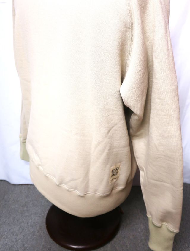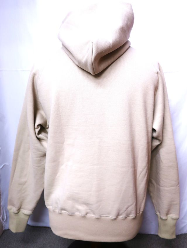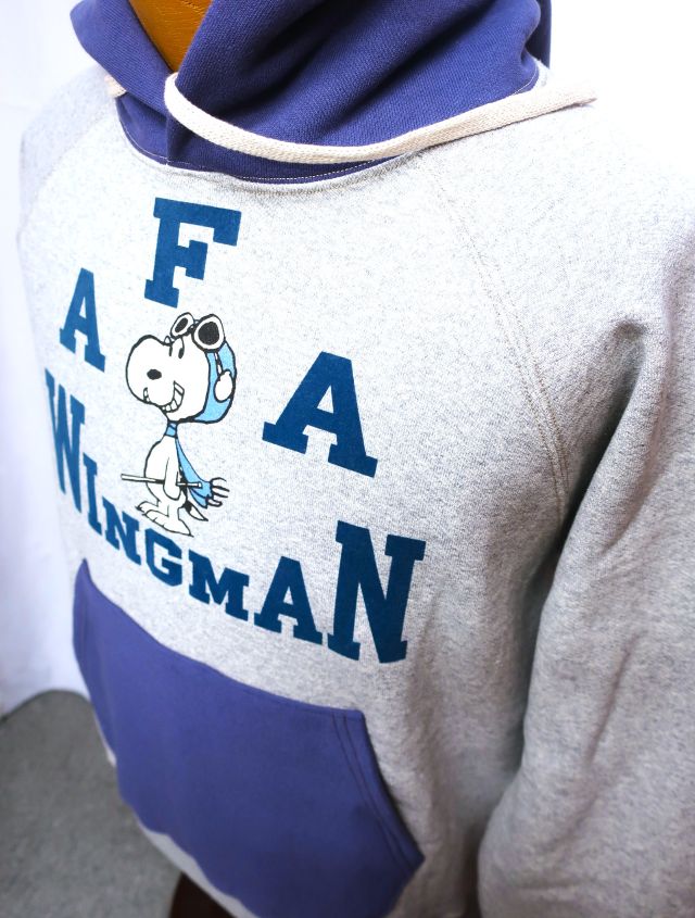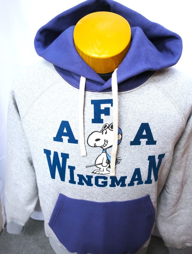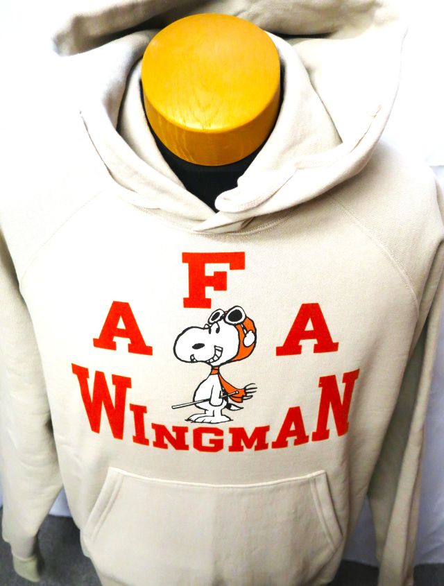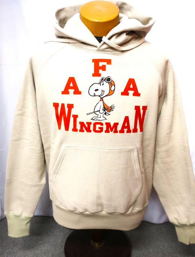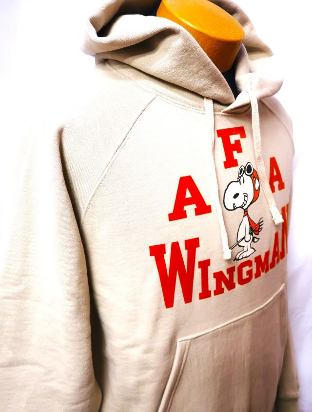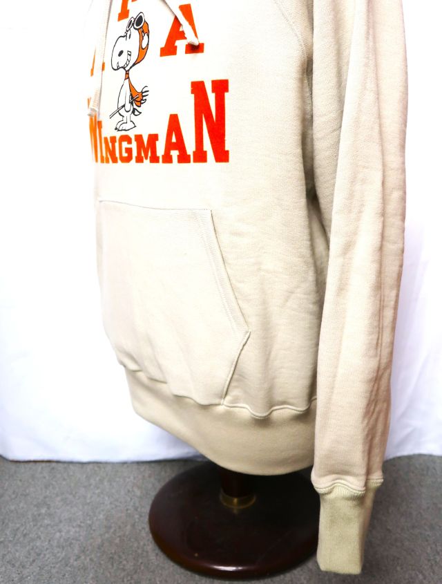 【 特徴 】 生地そのものの重さで絶妙なテンションをもたせながら丸い筒型に生地を編む、前時代の“吊り編み機”で仕立てた、裏起毛のスウェット生地を新調し、同生地でつくったプルオーヴァー・スウェットパーカ。この自信作に“FLYING ACE”のスヌーピーを版画風に、レタードをフロッキーでプリントした。