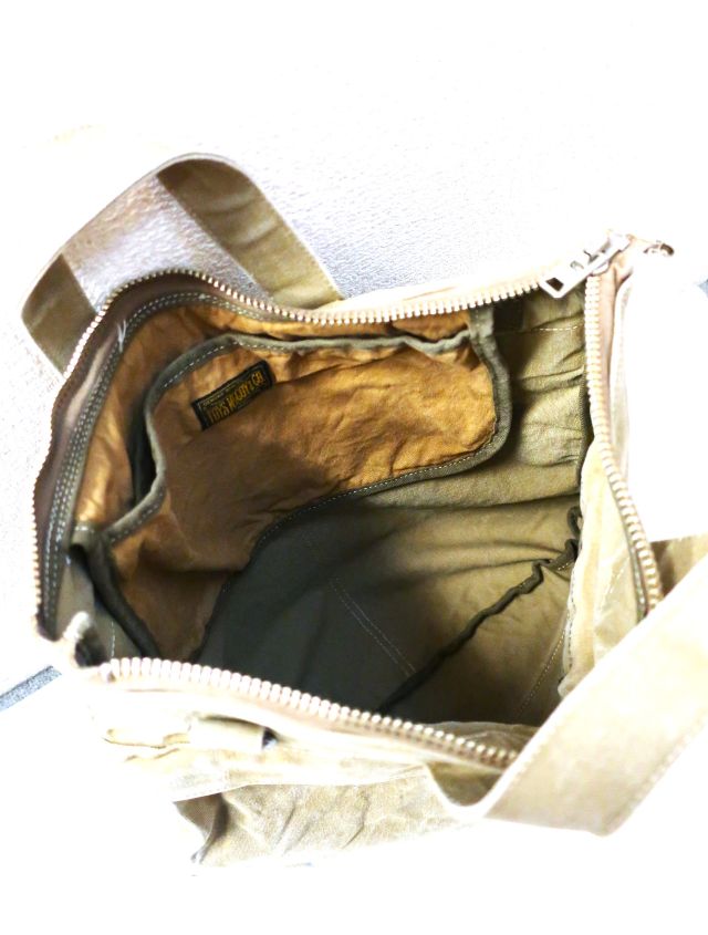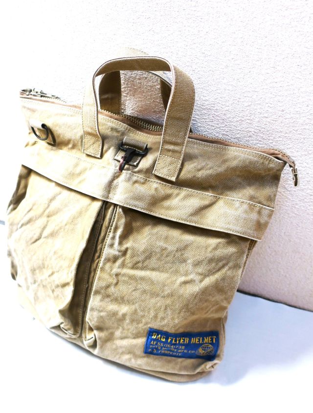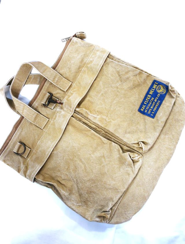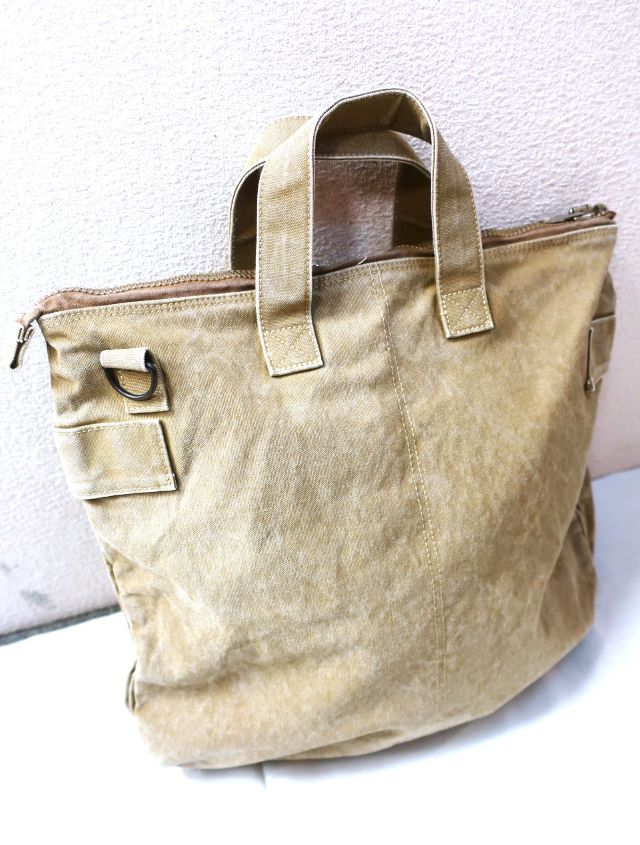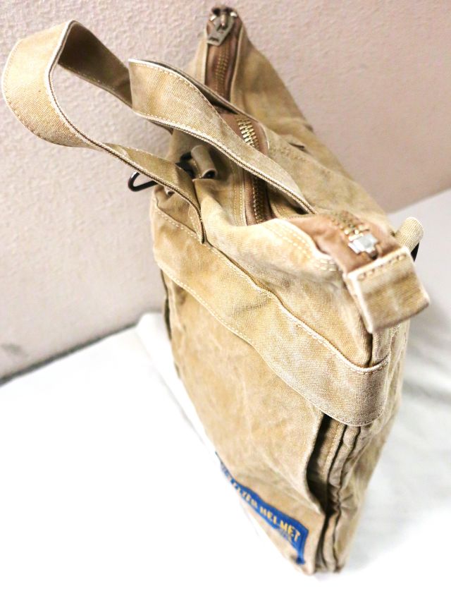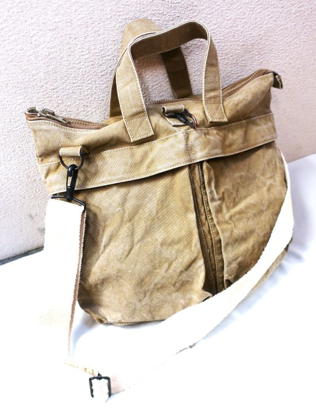航空兵がヘルメットを傷つけずに運べるヘルメットバッグをタウンユースに、をコンセプとした左のレザーモデルとともに、今季は質実剛健なコットンキャンバスバージョンをリリースした。キャンバス生地はウォッシュ加工を施されており、ヴィンテージバッグさながらの、味のある表情となっている。