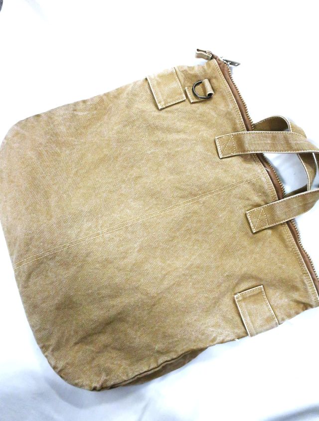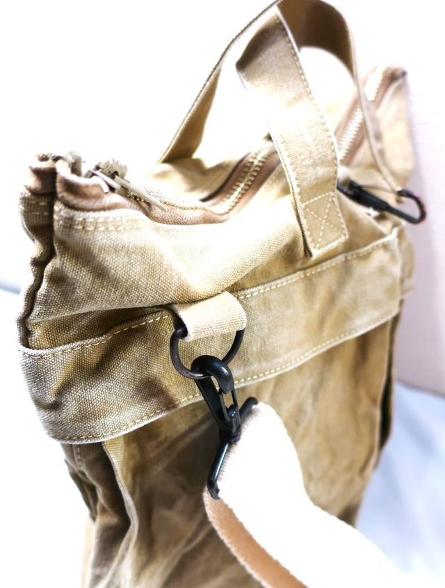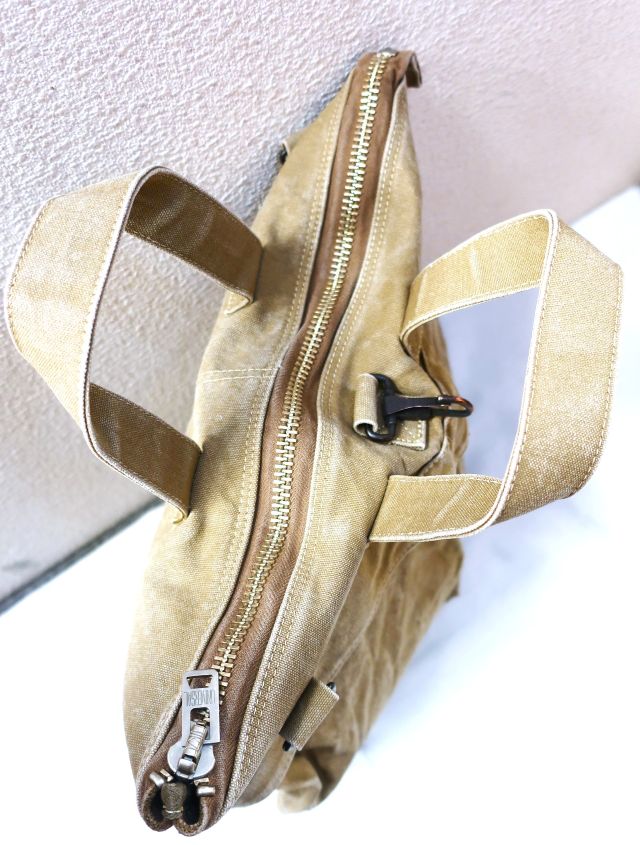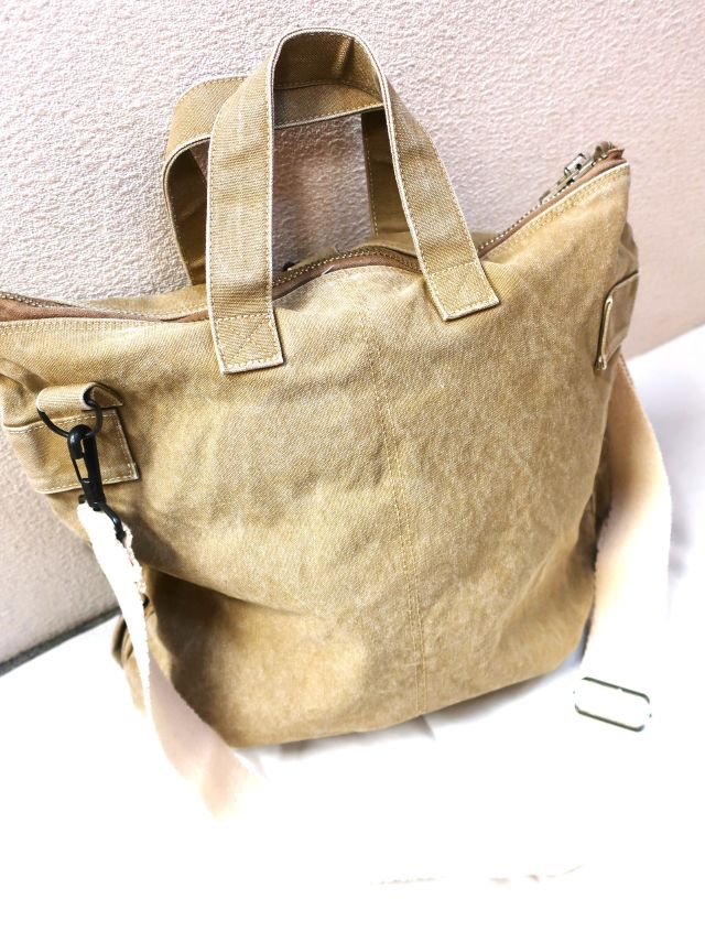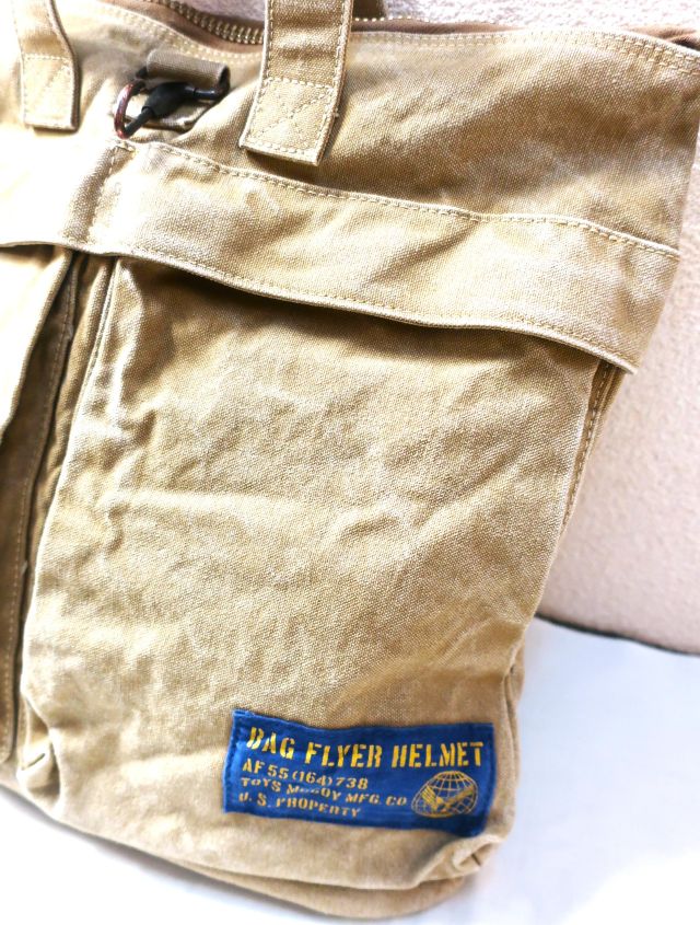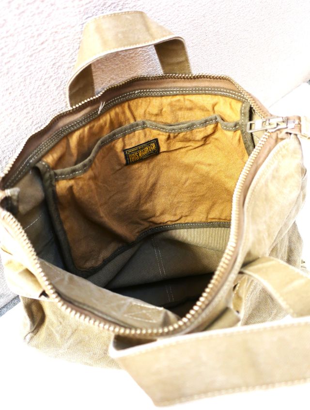 航空兵がヘルメットを傷つけずに運べるヘルメットバッグをタウンユースに、をコンセプとした左のレザーモデルとともに、今季は質実剛健なコットンキャンバスバージョンをリリースした。キャンバス生地はウォッシュ加工を施されており、ヴィンテージバッグさながらの、味のある表情となっている。
