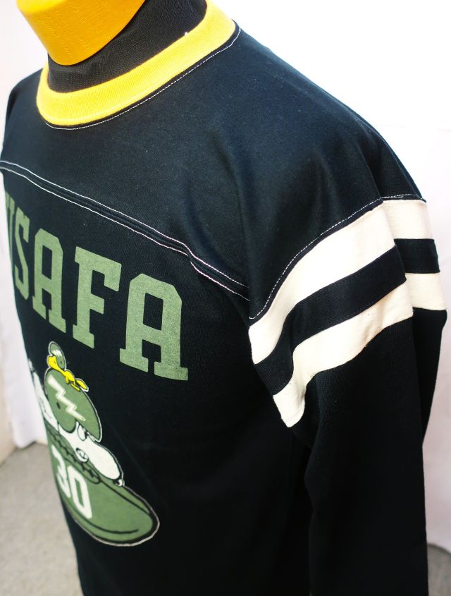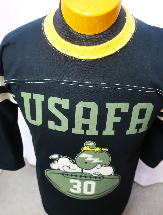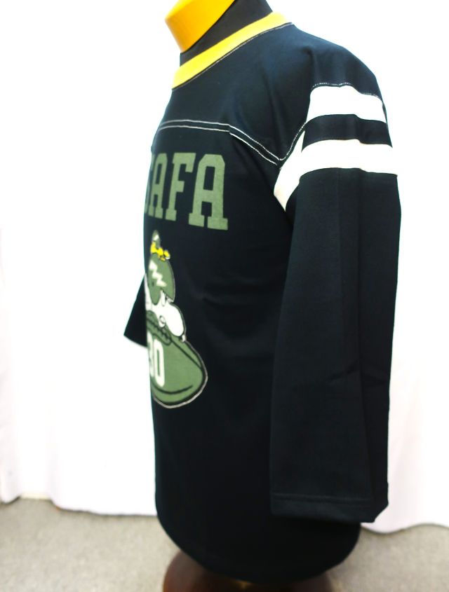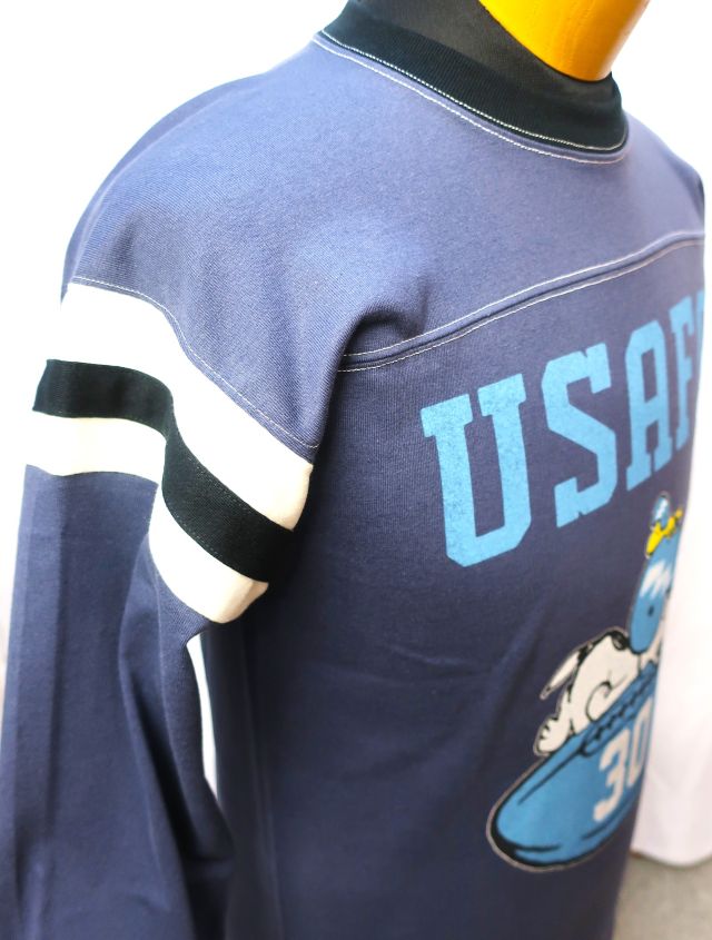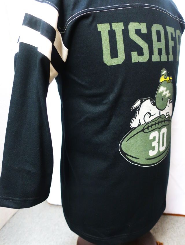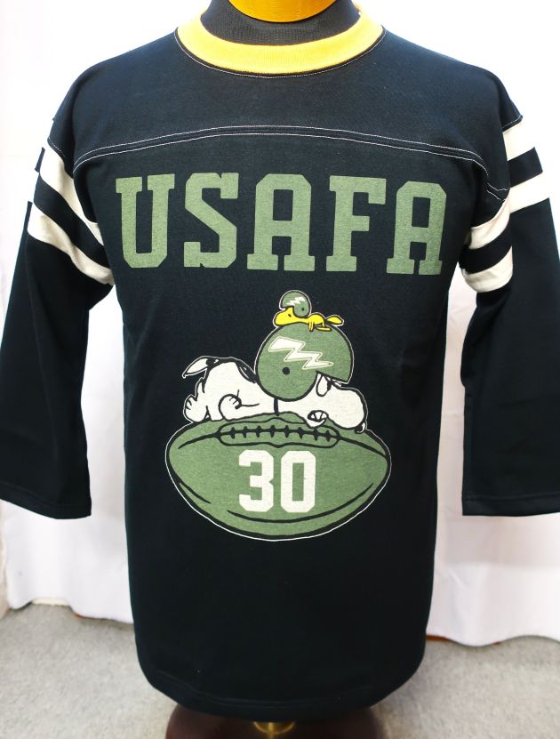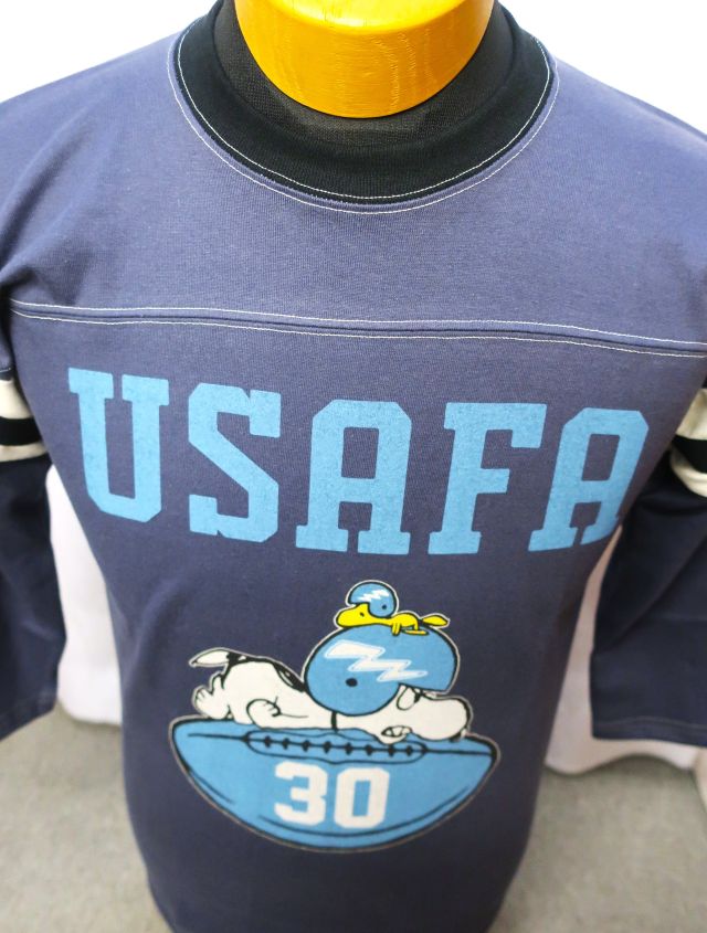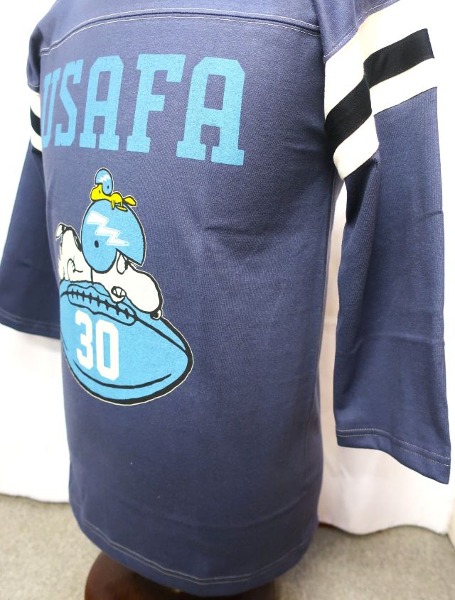 USAFA 30 SNOOPY FOOTBALL SHIRT 【 品番 】 TMC2611 【 色 】 ブルー / ブラック 【 サイズ 】 M / L 【 素材 】 綿100% 【 本体価格 】 13000円 【 特徴 】 洗濯後多少縮みます。 サイズ目安(cm) ※ 多少誤差あり 【 M 】 肩幅:50 身幅:49.5 着丈:69 袖丈:41 【 L 】 肩幅:52 身幅:53.5 着丈:70 袖丈:41.5