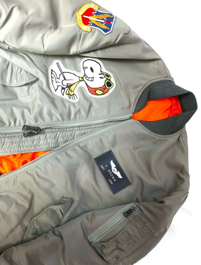ヴィンテージのMA-1"MIL-J-8279E"をトイズマッコイの英知をもって再現し、その時代にふさわしいスヌーピーを召還したカスタムモデルを発。米空軍整備飛行隊を物語の下地に、ピーナッツの中でも人気のストーリー“FLYING ACE”を乗せたカスタムは、背中に直刺繍のスヌーピー&ウッドストック。フロントはレザーネームプレート、FLYING ACEの刺繍パッチ、肩にTAC(戦術航空軍)のパッチがセットされています。