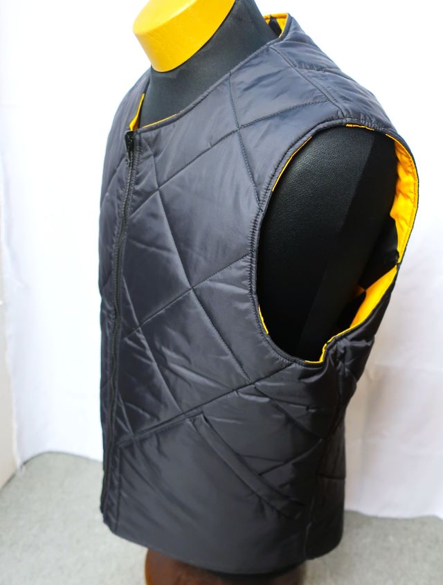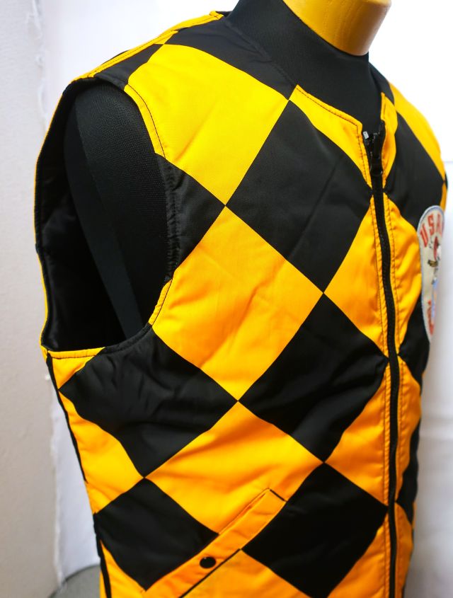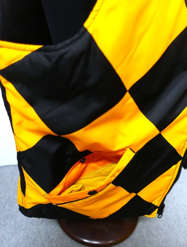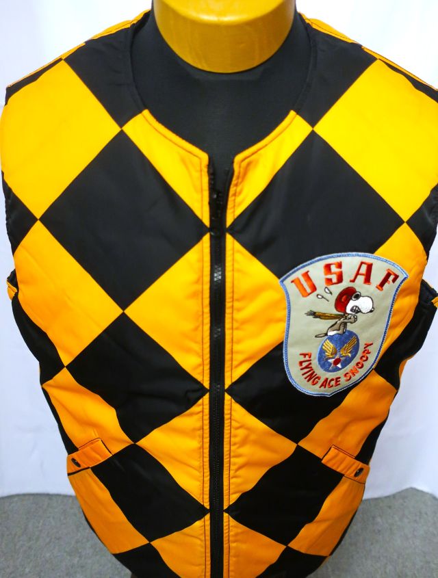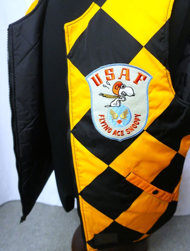 ユーティリティージャケットと同様のアークイエロー×ブラックのチェック柄に加え、ブラック単色のナイロンでリバーシブル仕様としたベスト。ライニングは保温性に優れたシンサレートを採用しており、レザージャケットの上からのレイヤリングに最適。そんな使い勝手の良いベストに“FLYING A BEST"スヌーピーの刺繍パッチをプラスしています。
