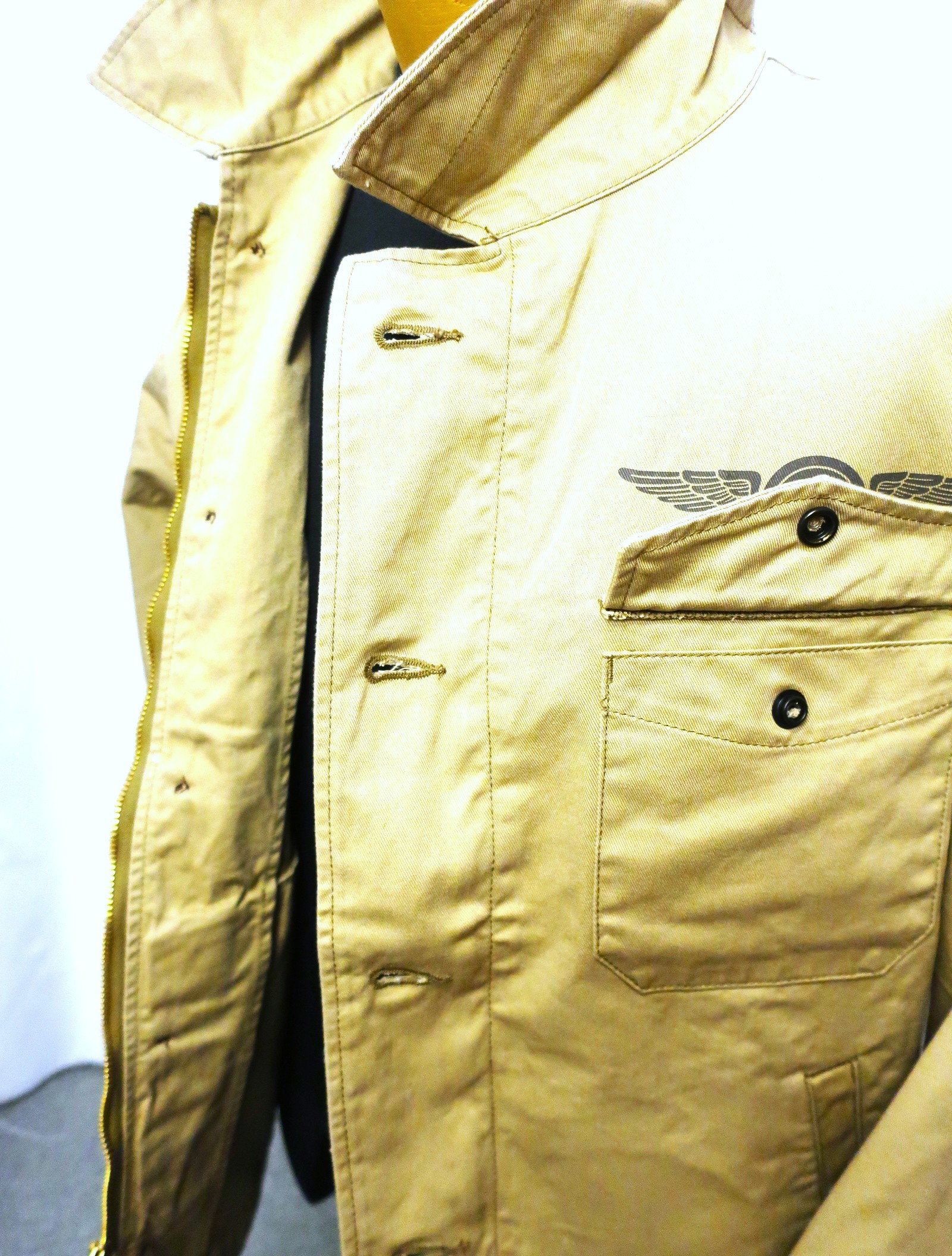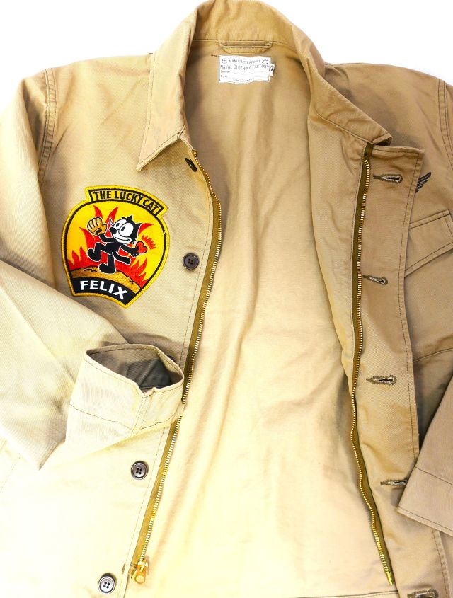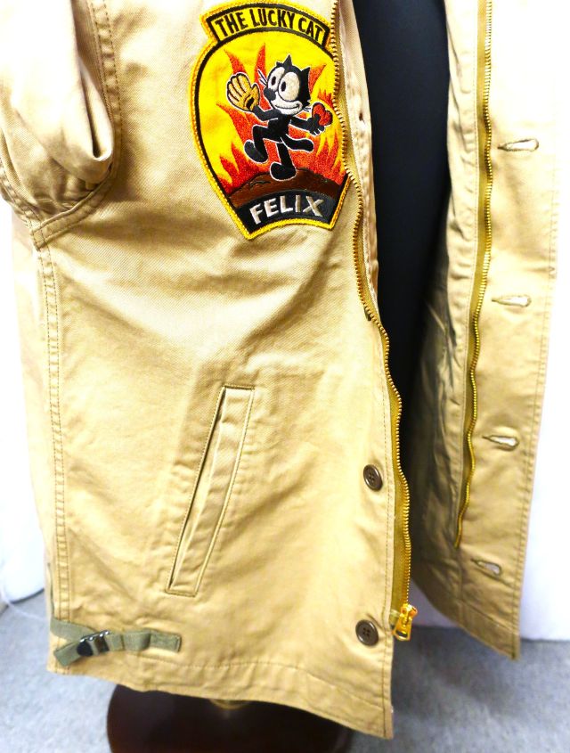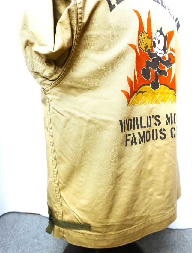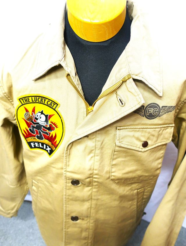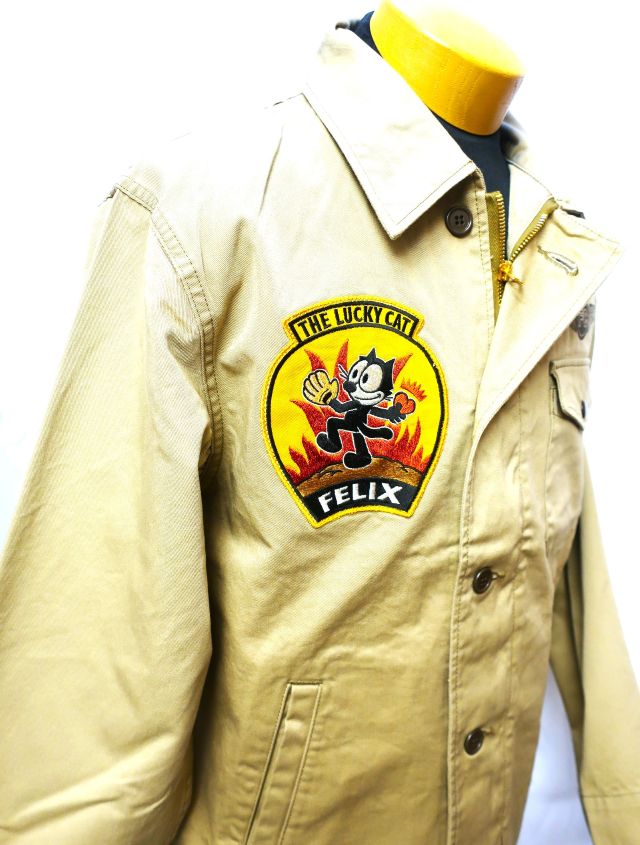 【 特徴 】 A-2デッキJKTに準ずるデザインの米海軍ユーティリティーJKTをベースに、FELIX THE CATのデコレーションを施したカスタムモデル。アイデアソースとしたのは'50年代に活躍した、全天候戦闘飛行隊4“VF(AW)-4ナイトキャッパーズ”。躍動感のあるポーズでボールの代わりにハートを投げる同部隊のSQパッチを我らがFELIXに置き換えた刺繍パッチとし、背中にも同図柄の イラストを迫力のサイズで表現している。