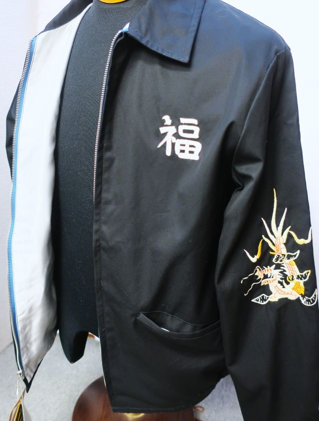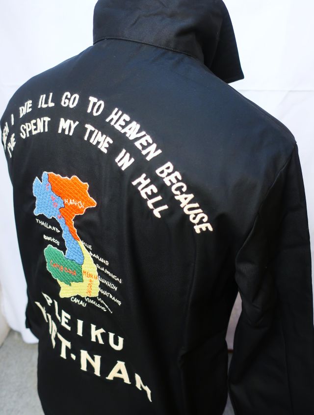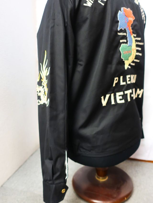 1960年代中期、ベトナムの都市・PLEIKU (プレイク)の米軍基地に駐留していた兵士がアメリカへ持ち帰った一着を再現。刺繍は右胸に虎、左胸に「福」の文字、両袖に龍、背中にベトナムの地図を描いたベトジャンにおける王道のデザイン。ヴィンテージのベトジャンには刺繍が粗い個体も多いが、本作は密度が高く優れたクオリティの刺繍を再現している。袖口にはヴィンテージ同様、古銭を模したボタンを採用。