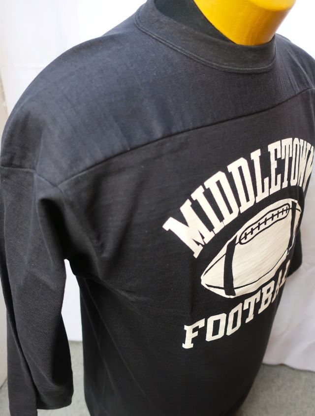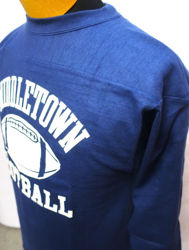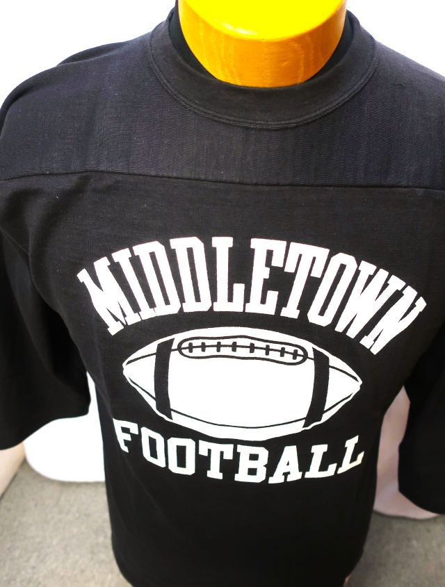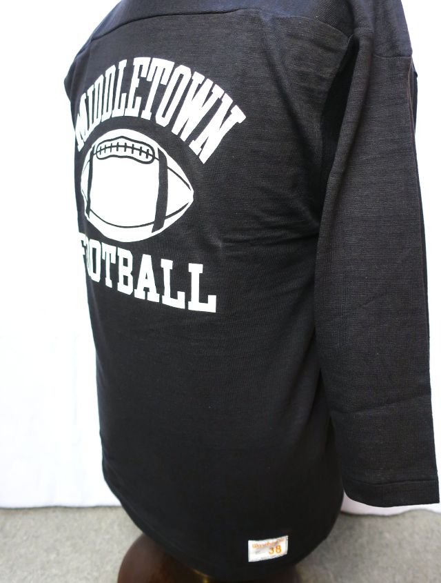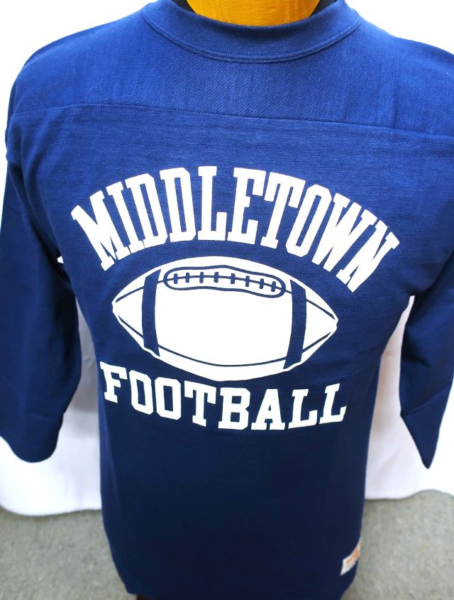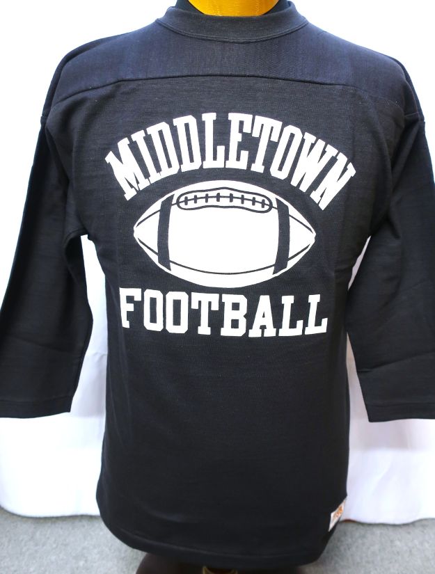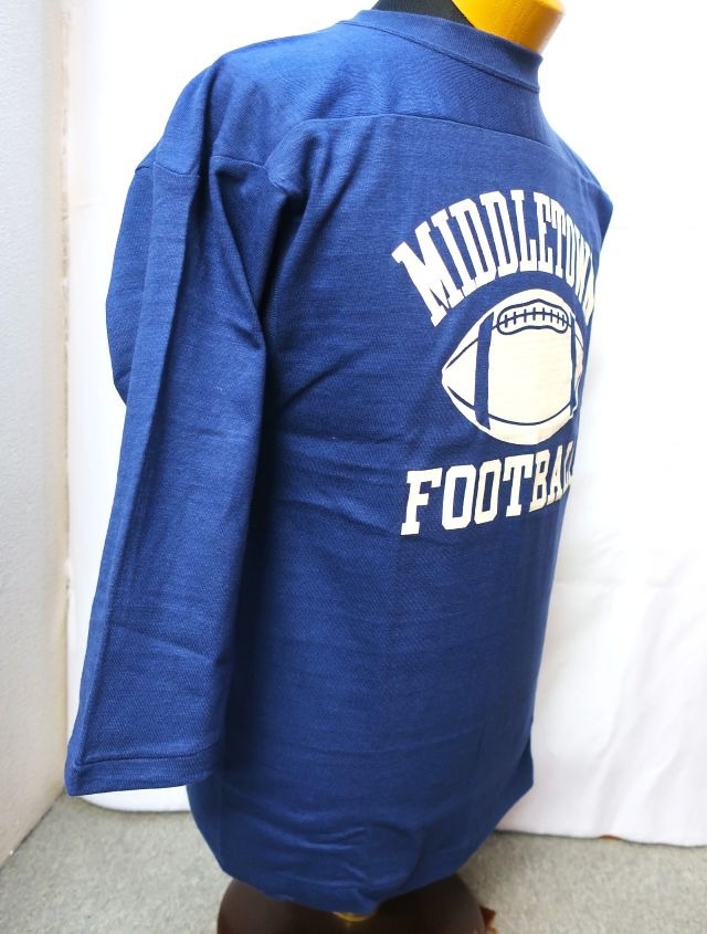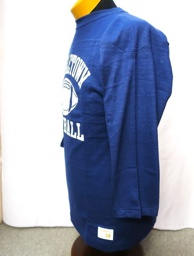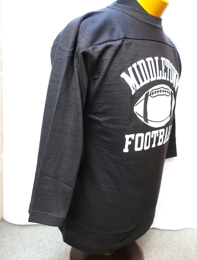 12番ムラ糸 天竺生地を使用したフロントにひび割れプリントが施された7分袖のフットボールTシャツです。